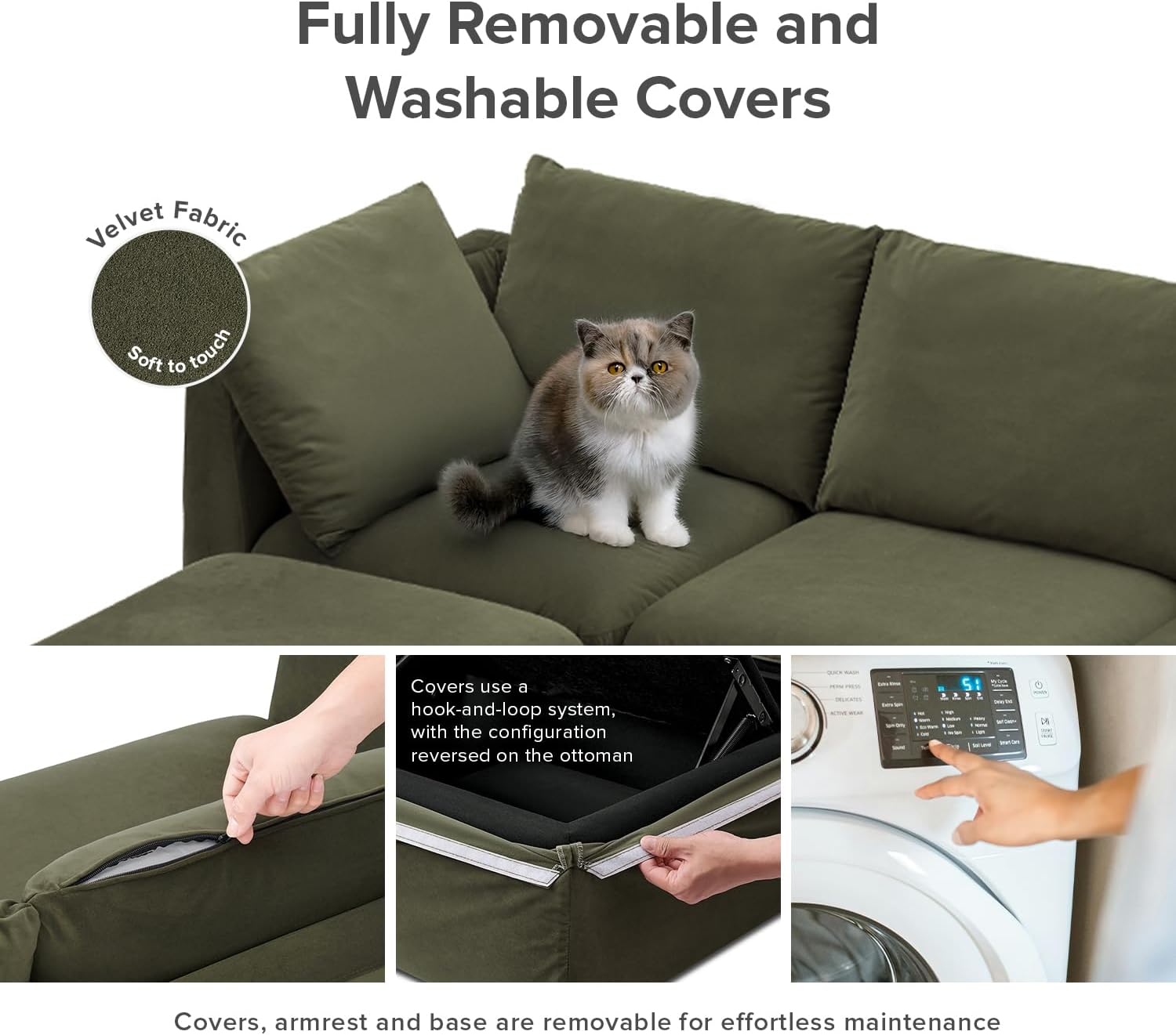- Fully Removable & Washable Covers for Easy Care: Designed to keep up with real life, all covers, including the armrests and base, are fully removable and machine washable. Whether you’ve got kids, pets, or just the occasional spill, this sofa is easy to keep fresh and clean