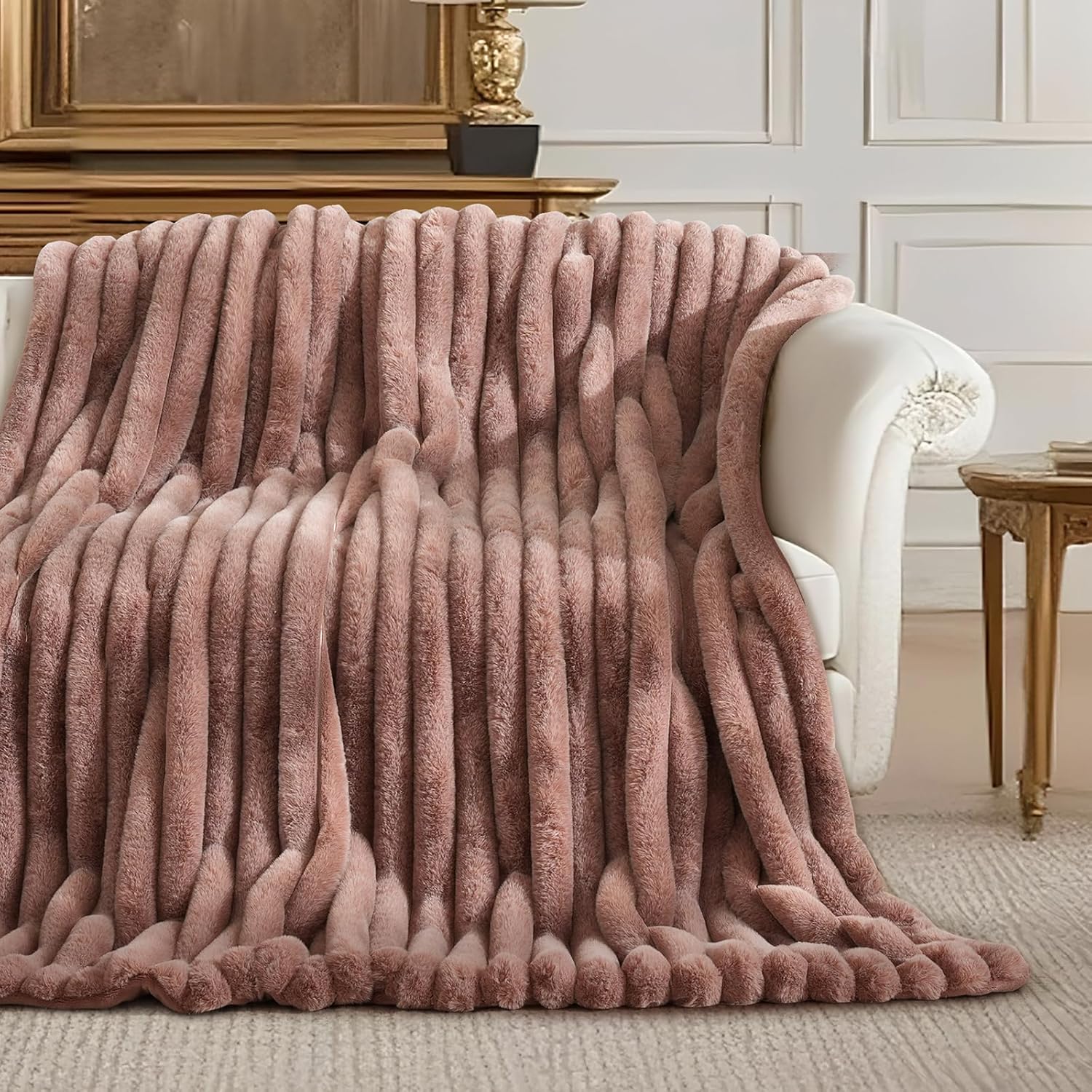 - Easy-Care & Long-Lasting: Zero Hassle Maintenance – Unlike real fur, this blanket thrives in your washing machine! Cold gentle cycle + low tumble dry keeps its lush texture intact. Stain-resistant fibers repel spills, and anti-pilling technology ensures it stays flawless for years. (Pro tip: Use a pet brush to fluff up the fibers after washing!)