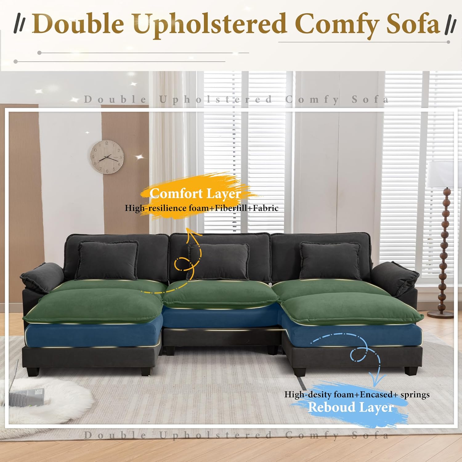 URRED Modular Sectional Sofa Comfy Cloud Couch, Modern Velvet Sofa Sleeper Deep Seat Couches with Ottoman/Pillows for Living Room (Dark Gray, 117'' - U Shape)