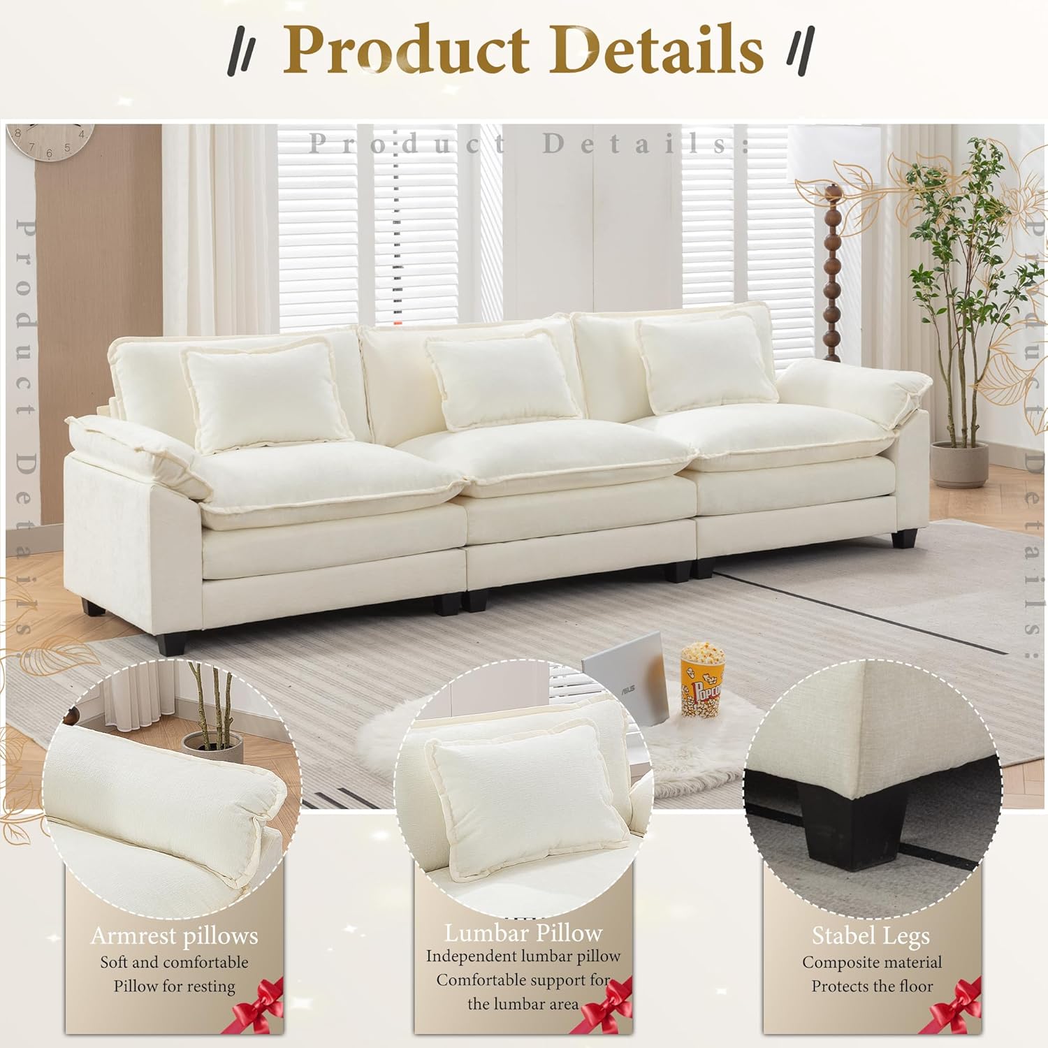 URRED Modular Sectional Sofa Comfy Cloud Couch, Modern Chenille Sofa Sleeper Deep Seat Couches with Ottoman/Pillows for Living Room (White, 117'')