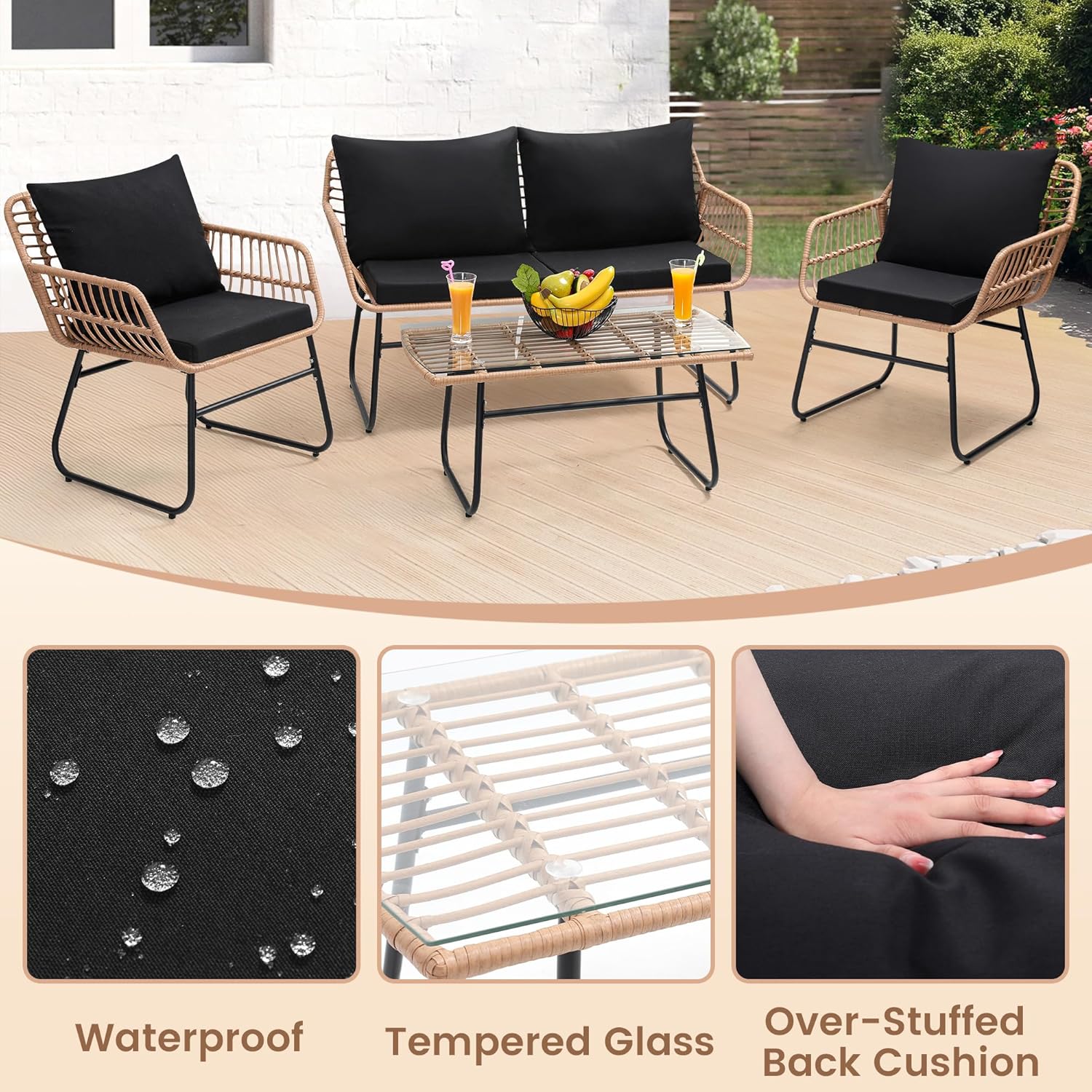 Kromax 4 Piece Patio Bistro Outdoor Furniture Set, Wicker Sofa, 2 Rattan Chairs, and Table, Backyard Conversation Set, All Weather Cushions, Natural Rattan Black Cushion