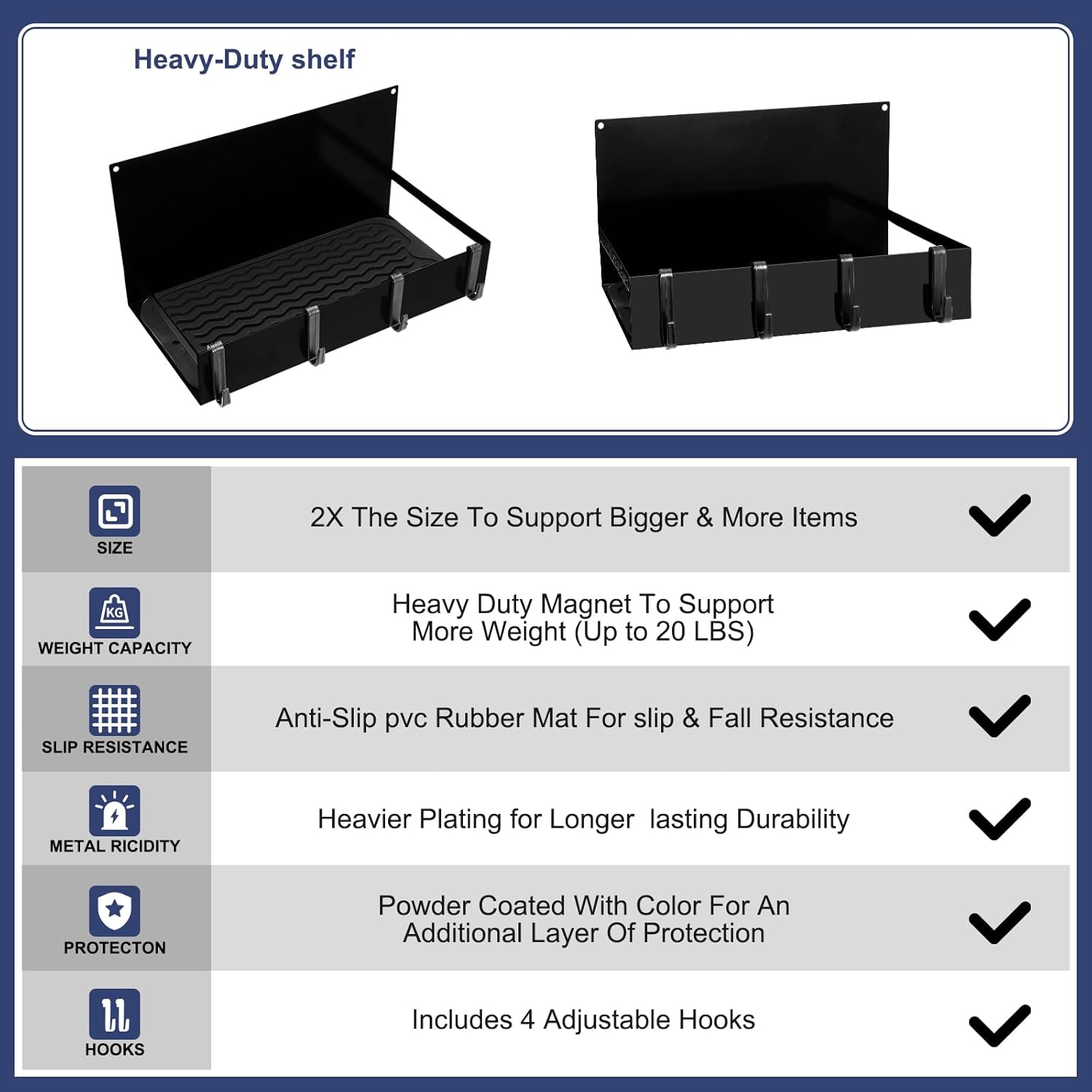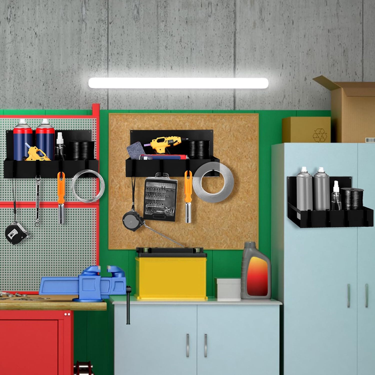 - Included Components : 12 x Hanging hooks, 3 x Black non slip pads, 3 x Magnetic tool box trays