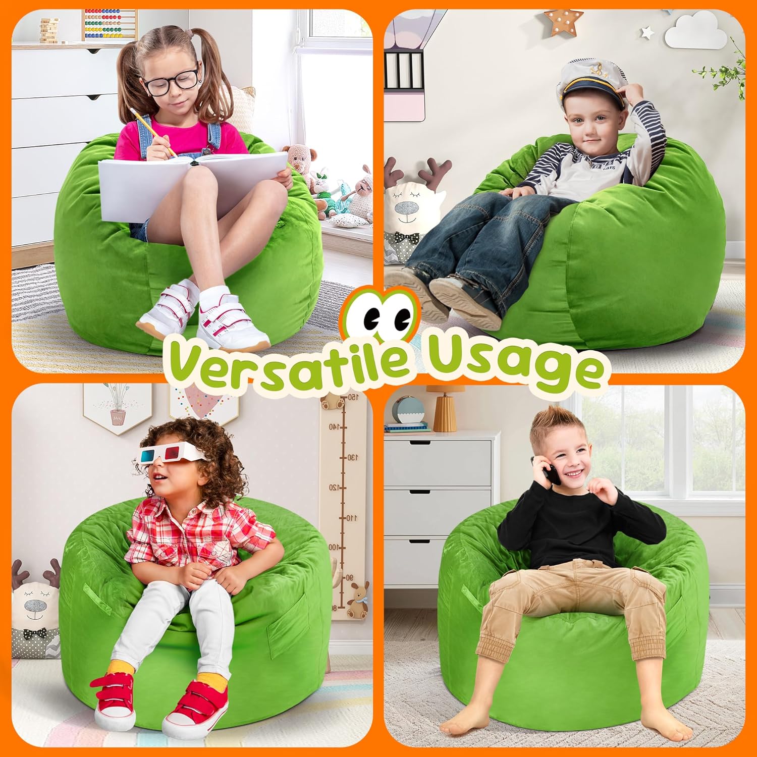 - Comfortable Bean Bag Chairs: Boys and girls alike will enjoy the comfy beanbag chairs. The bean bag cover is made of 100% skin-friendly and soft fabric, and it's filled with high-density memory foam, which is super comfortable and supportive to sit on.