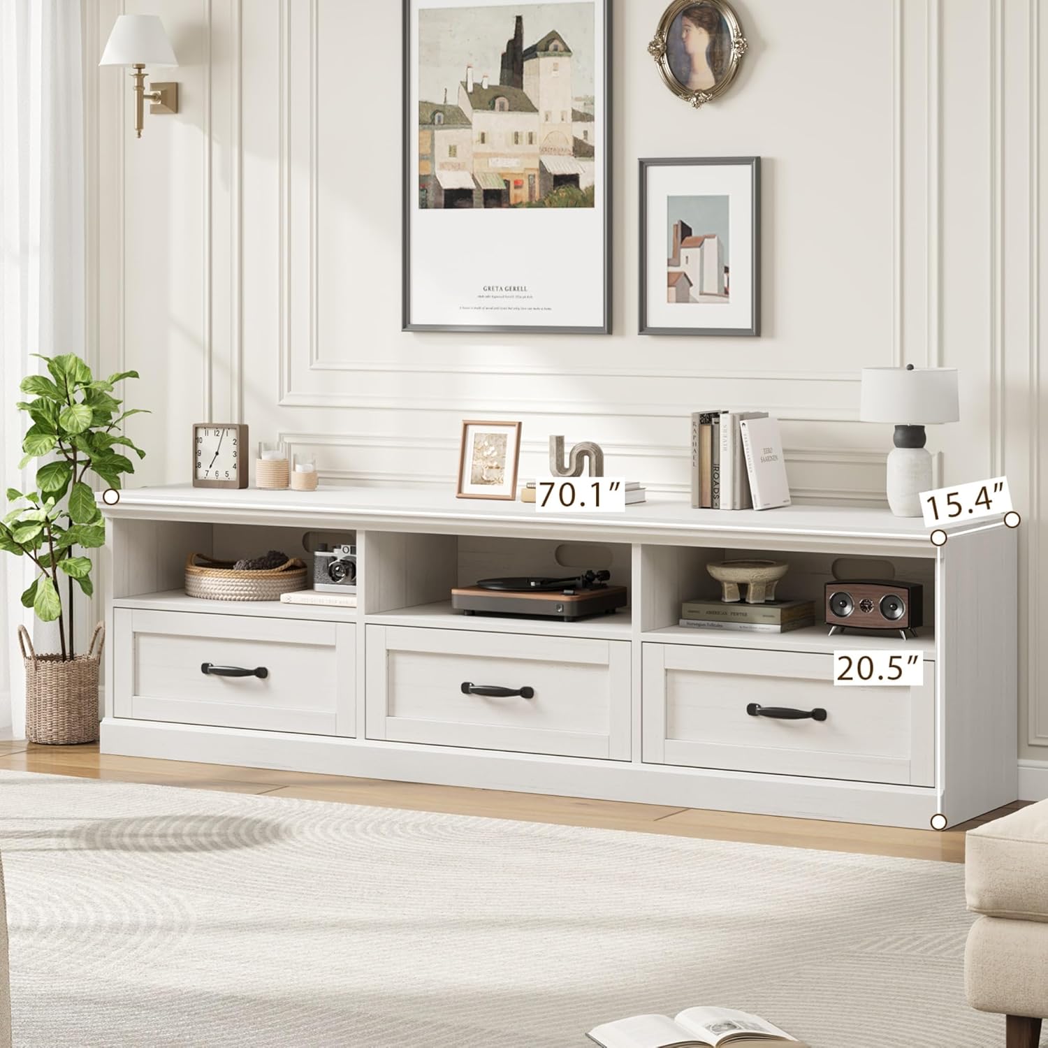 - DIMENSIONS & STORAGE: This tv cabinet measures 70β L x 15.4β W x 20.5β H and accommodates flat or curved TVs up to 75 inches. The tv console table provides ample storage space with a combination of open shelves for decor and media devices, plus drawers to neatly stow away remotes, cables, and other essentials
