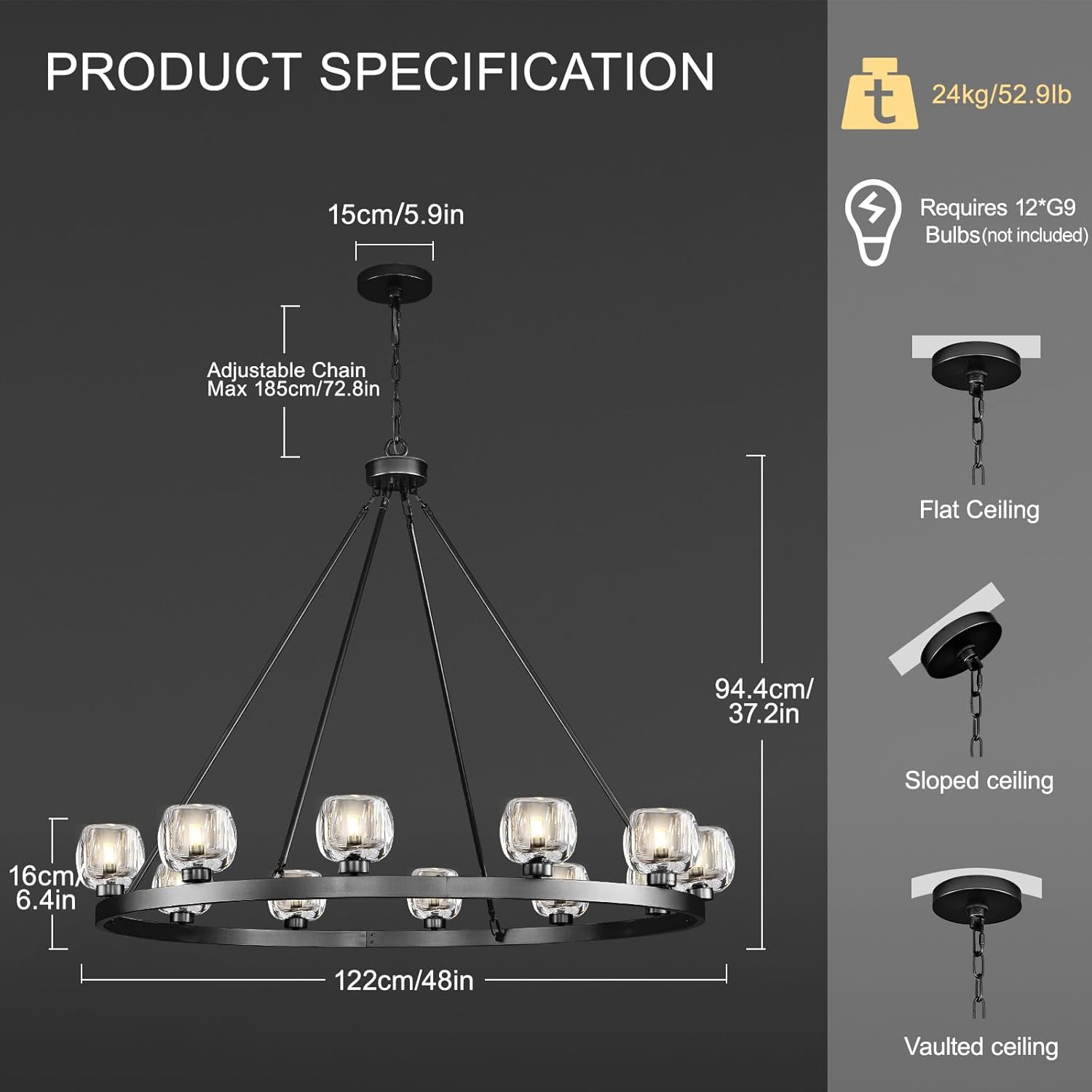 • 【12-Light Chandelier】Black wagon wheel chandelier offers 360° light coverage to brighten your space & create a cozy vibe. The round chandeliers for dining room requires 12 G9 bulbs and available for infinite dimming via a dimmer. (Dimmable bulbs & dimmer not included).
