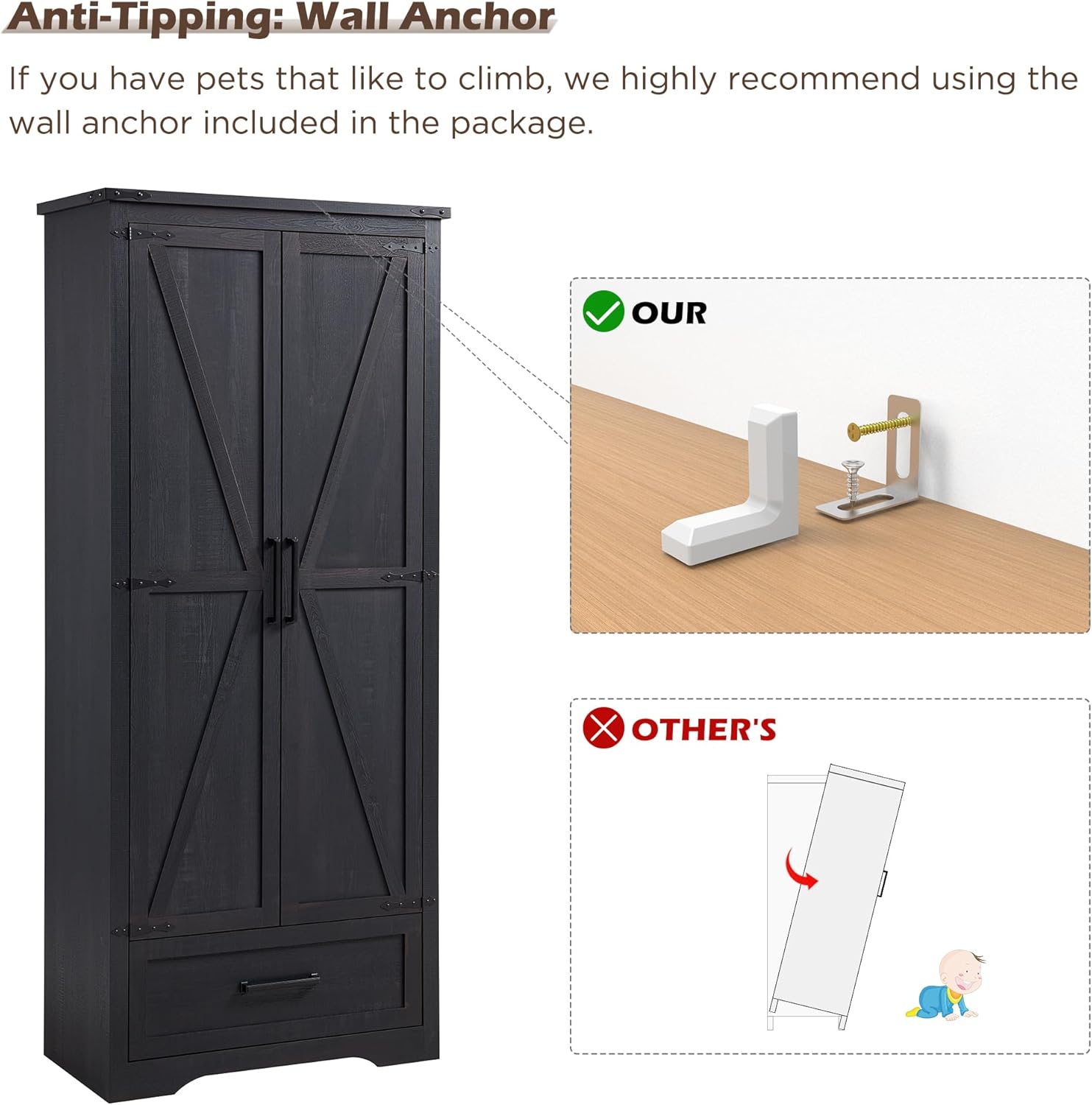 72" Tall Wood Storage Cabinet, Farmhouse Kitchen Pantry Cabinet with Adjustable Shelves & Drawer & Barn Doors, Versatile Storage for Kitchen, Dining Room, Bathroom, Black