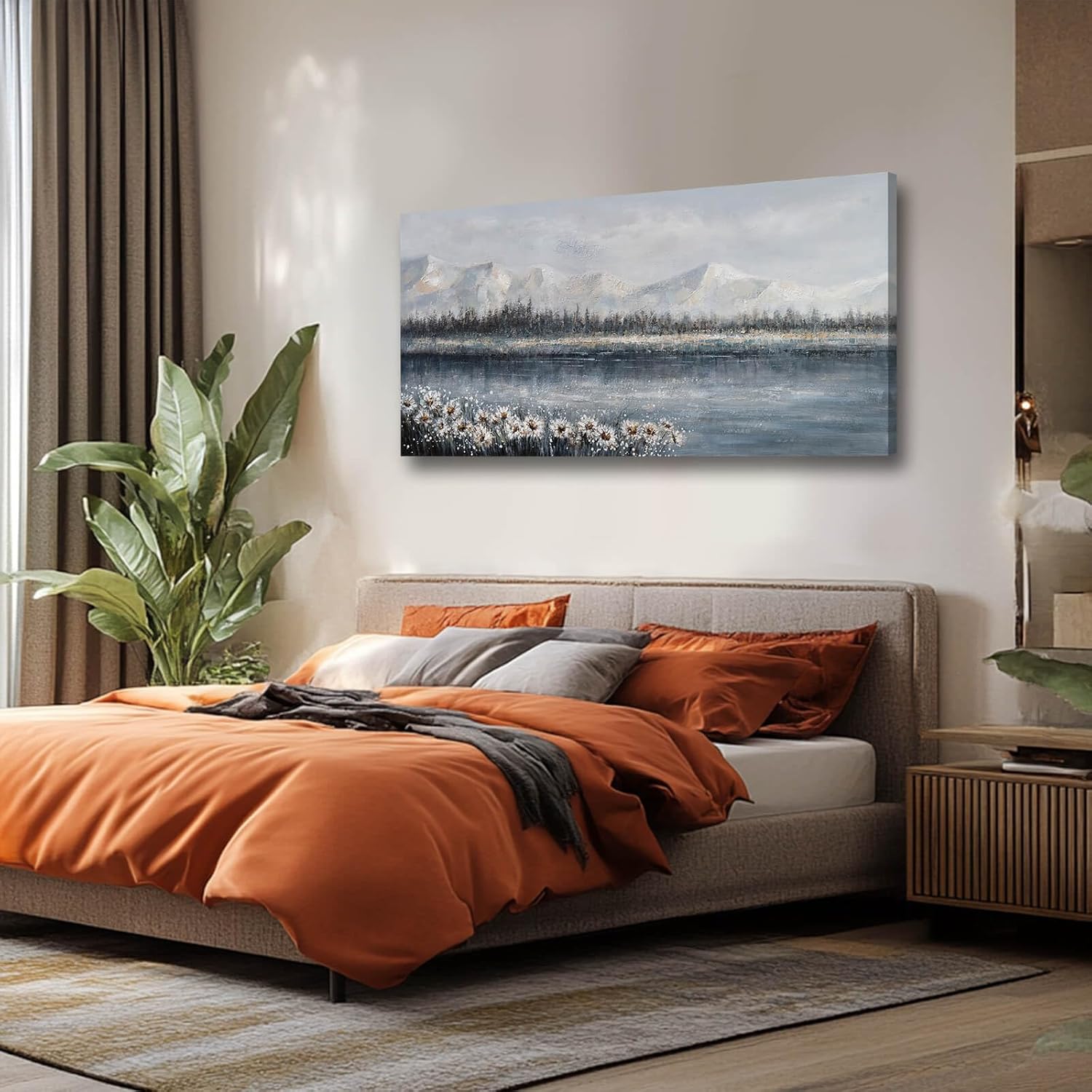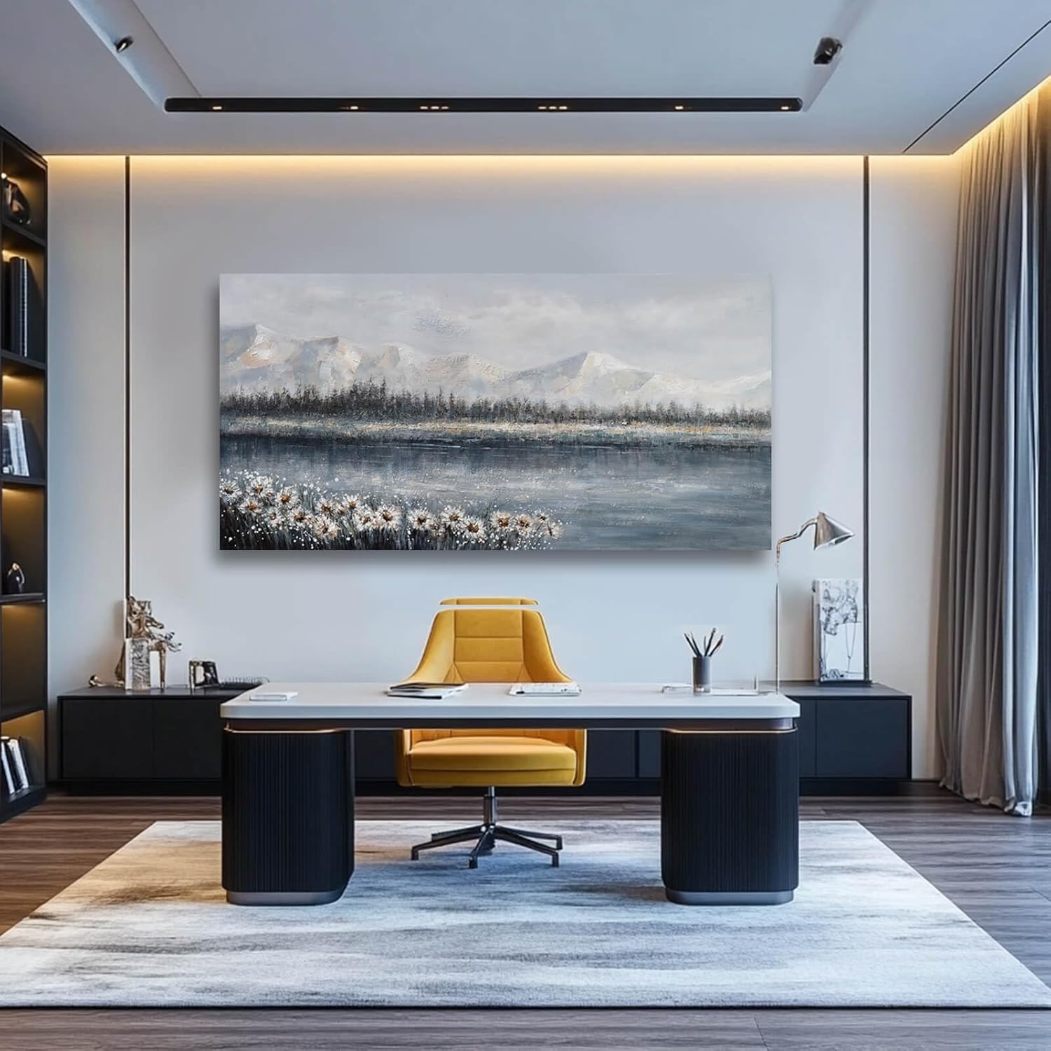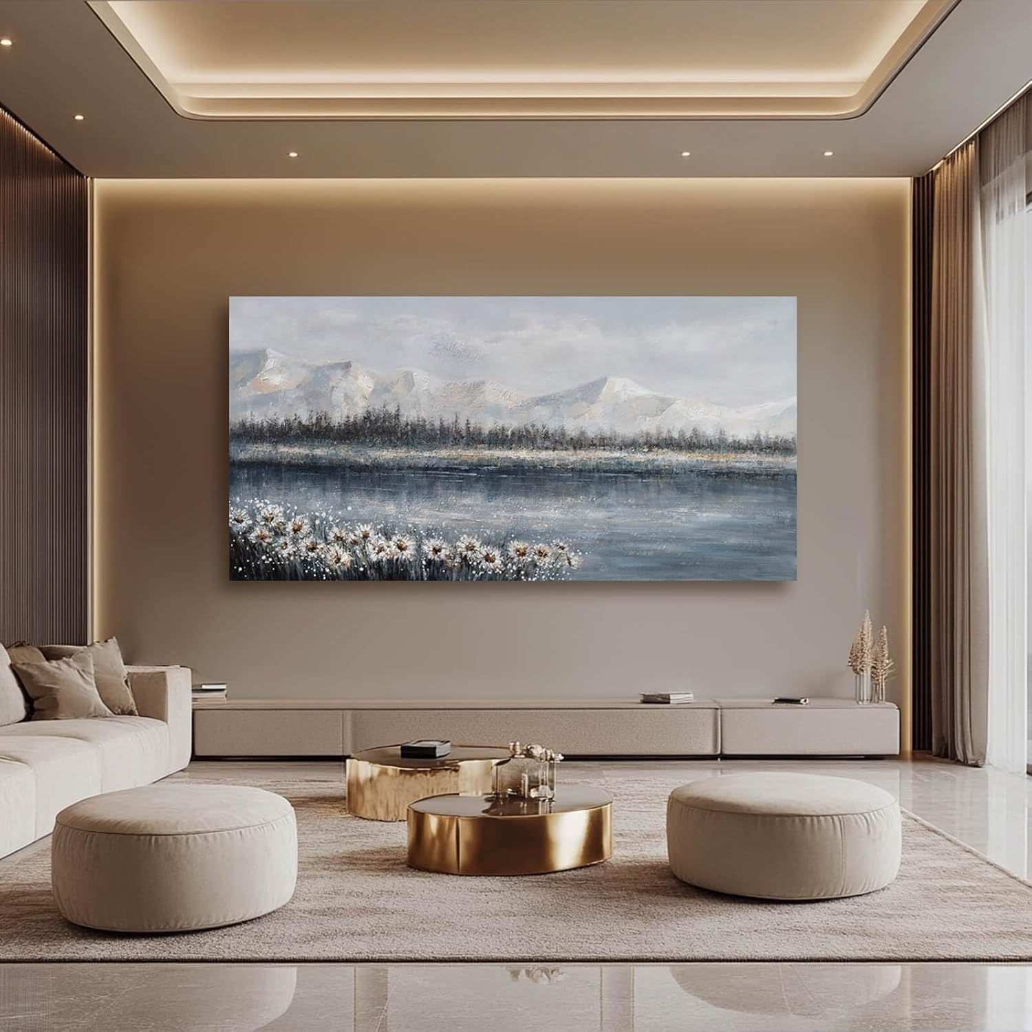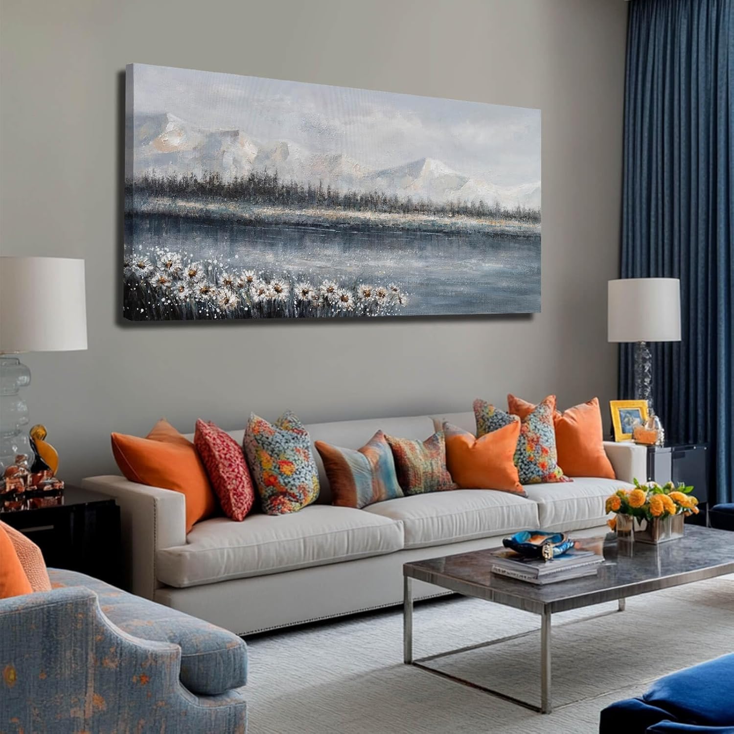 White Wall Art for Living Room Daisy Pictures Framed Floral Wall Decor Abstract Wall Art Mountain Landscape Artwork Office Arts for Home Office 29"x58"