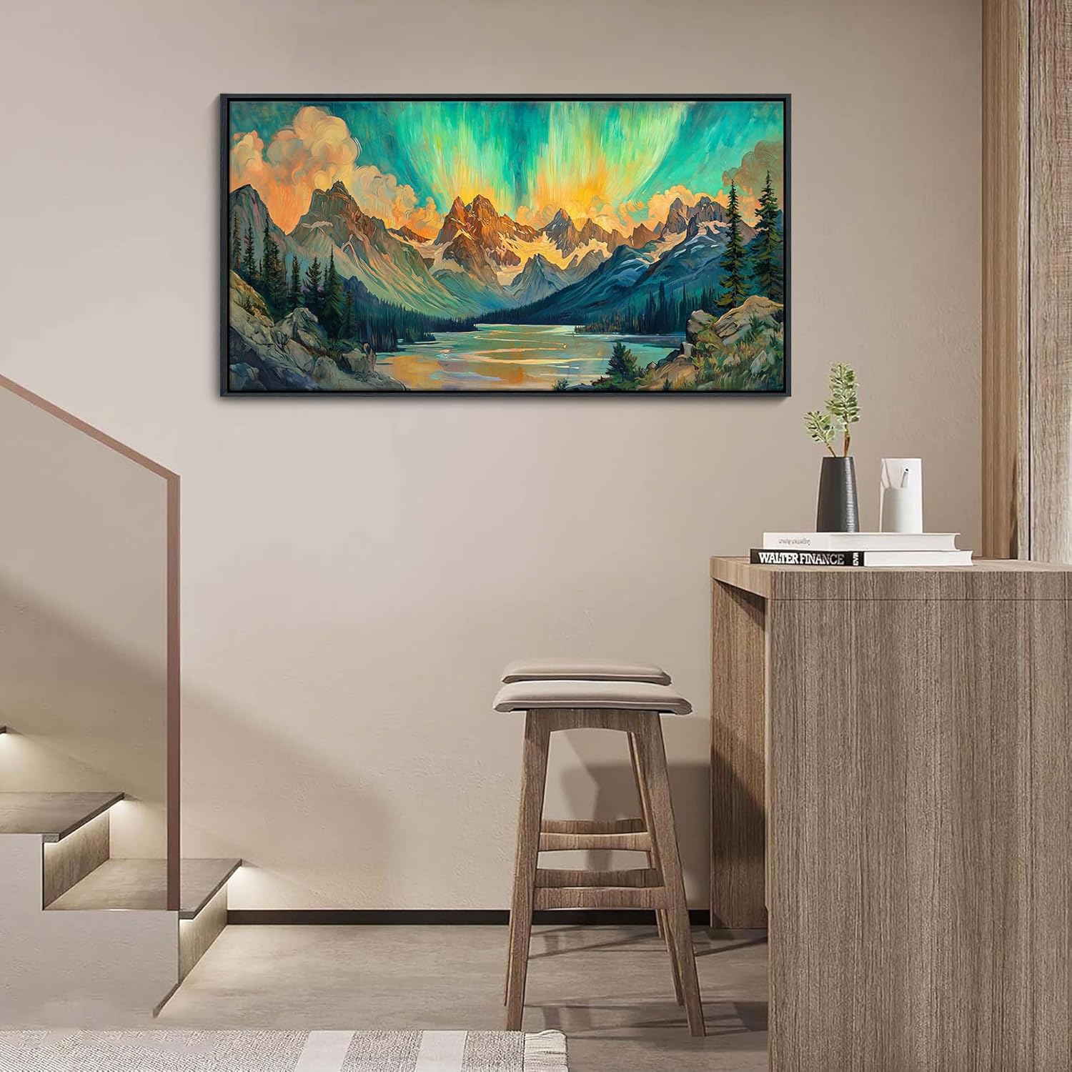 JEAWA Framed Canvas Wall Art - 20x40 In Abstract Painting Decor, Textured Mountain Lake Tree Aurora Pictures, Modern Art Prints for Bedroom Living Room Bathroom Home Decoration