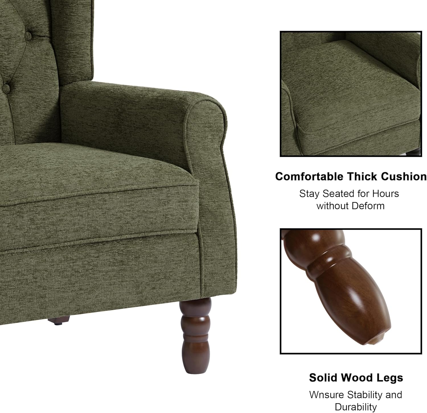 - Comfy and Robust Build Reading Chair: Our comfy bedroom chair with solid wood frame construction can easily support the weight of 400 Lbs. And the cushion and back of this sofa chair is made of high-density and high-elasticity foam, which can provide you with maximum comfort