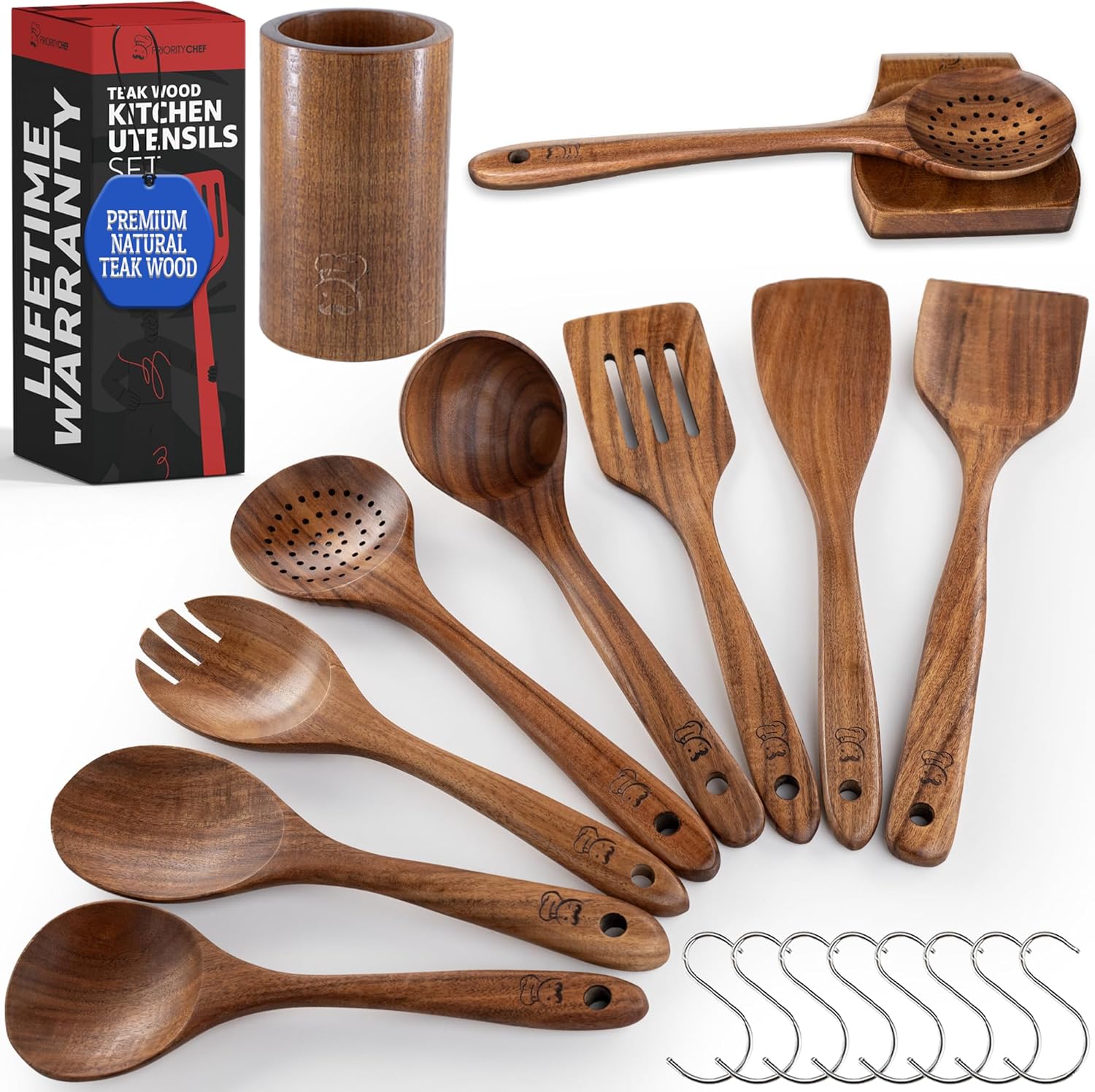 - Built Tough, Made to Look Good - Durable enough for daily meals, good-looking enough for guests. This teak wooden kitchen utensils set holds up to heat, moisture, and constant use - while still looking clean and classic every time you grab it.