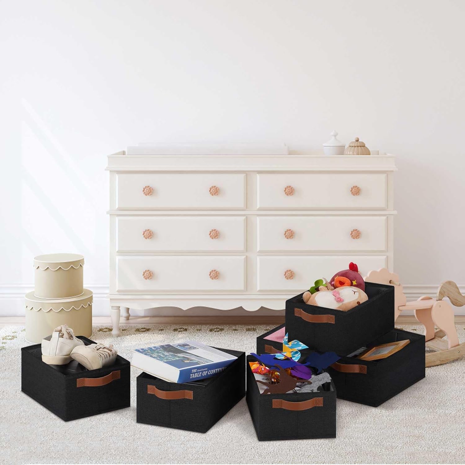 - 👍【QUALITY MATERIAL】Storage baskets for shelves are made of high-quality cationic fabric and polyester cotton fabric, and the inner layer is made of non-woven fabric, which is odorless, long-lasting and strong. Classic faux leather handles that adds a comfortable touch and provides a strong and comfort grip to pull and move. Fabric storage bin is easy to clean, just wipe with a damp sponge or cloth