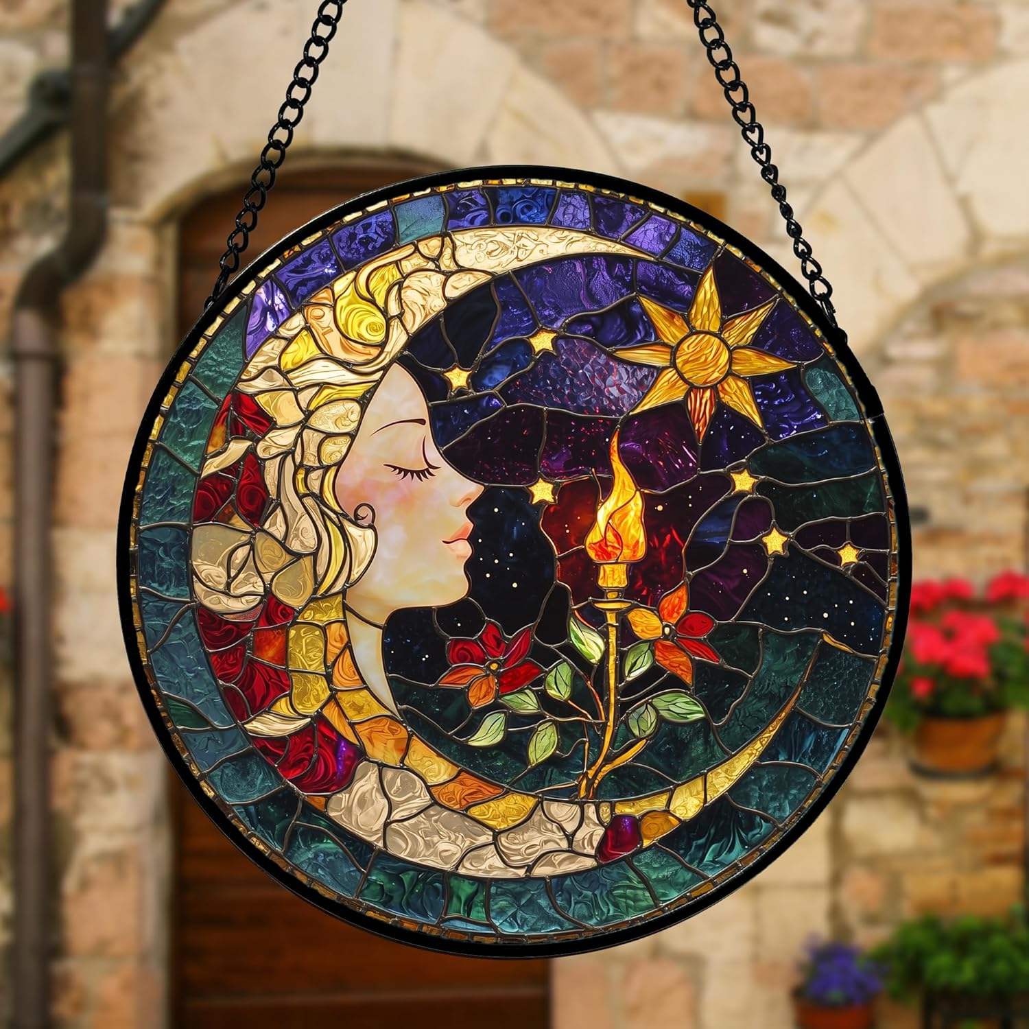 Stained Glass Window Hanging, Moon Goddess Torch Suncatcher Diamond Glass Panel Hangings Dream Sun Catchers Decor for Birthday for Women, Men, Wife, Aunt, and Mom 11.8x11.8 in