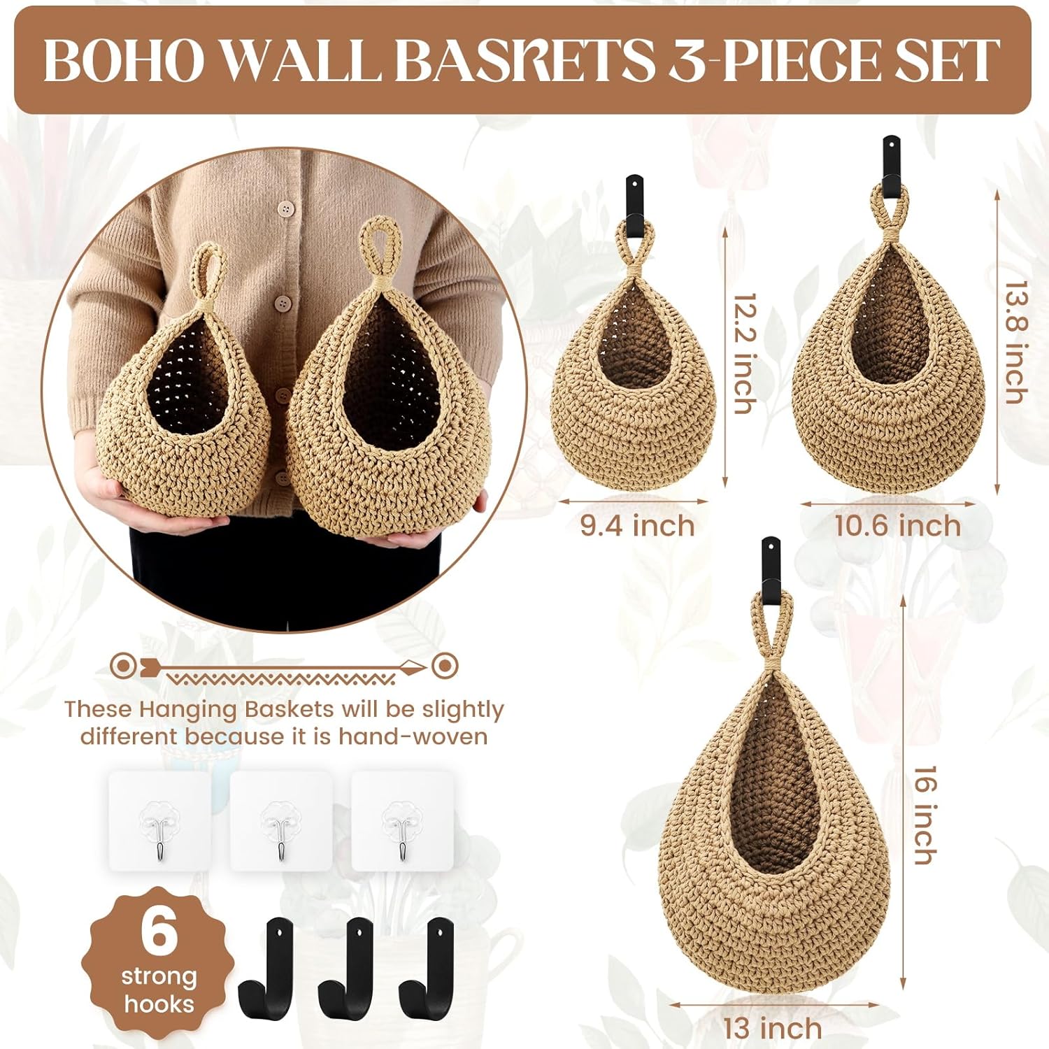 - 【Storage Basket Set】 - You will receive 3 different Boho wall baskets with 6 hanging hooks go together in a complete collection. Our hanging fruit basket wall decor offers a cohesive look when grouped together. Scattered around, these hanging wall basket create a customized arrangement. Save your home space, make your home more beautiful and your life more organized.
