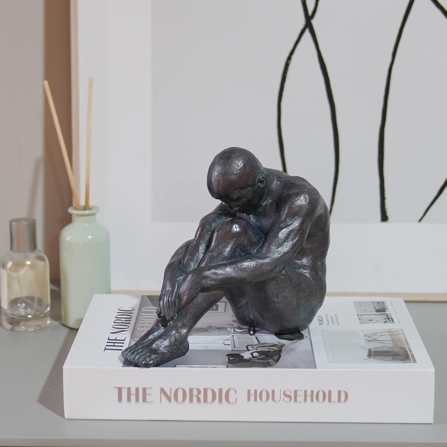 Guichifun Sitting Man Sculptures Home Decor - Resin Bronze Male Holding Arms Legs Lonely Statues Decorative Objects Outdoor Gift for Men 7.5 x 3.7 x 5.8 Inch