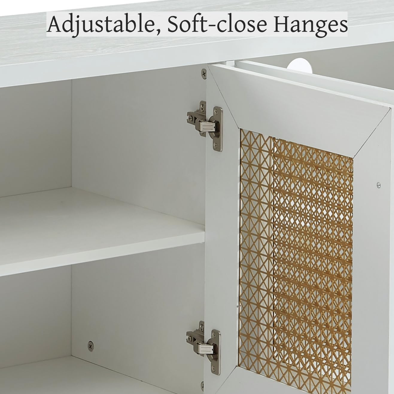 JYED Mid Century Modern TV Stand for TVs up to 75", 69.5" W White Entertainment Center with 4 Gold Metal Mesh Doors - Wood Grain MDF TV Console, Media Storage