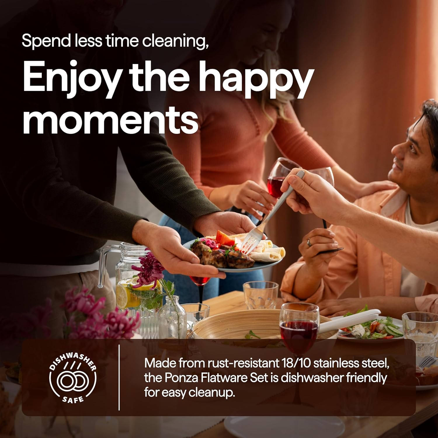 - Designed for Comfort & Precision: Every detail of this modern silverware set is made with care. The smooth edges and slightly rounded handles provide a comfortable grip, while the precision-serrated dinner knives ensure effortless cutting. Whether for everyday meals or special gatherings, this premium 18/10 stainless steel set makes every meal feel special.