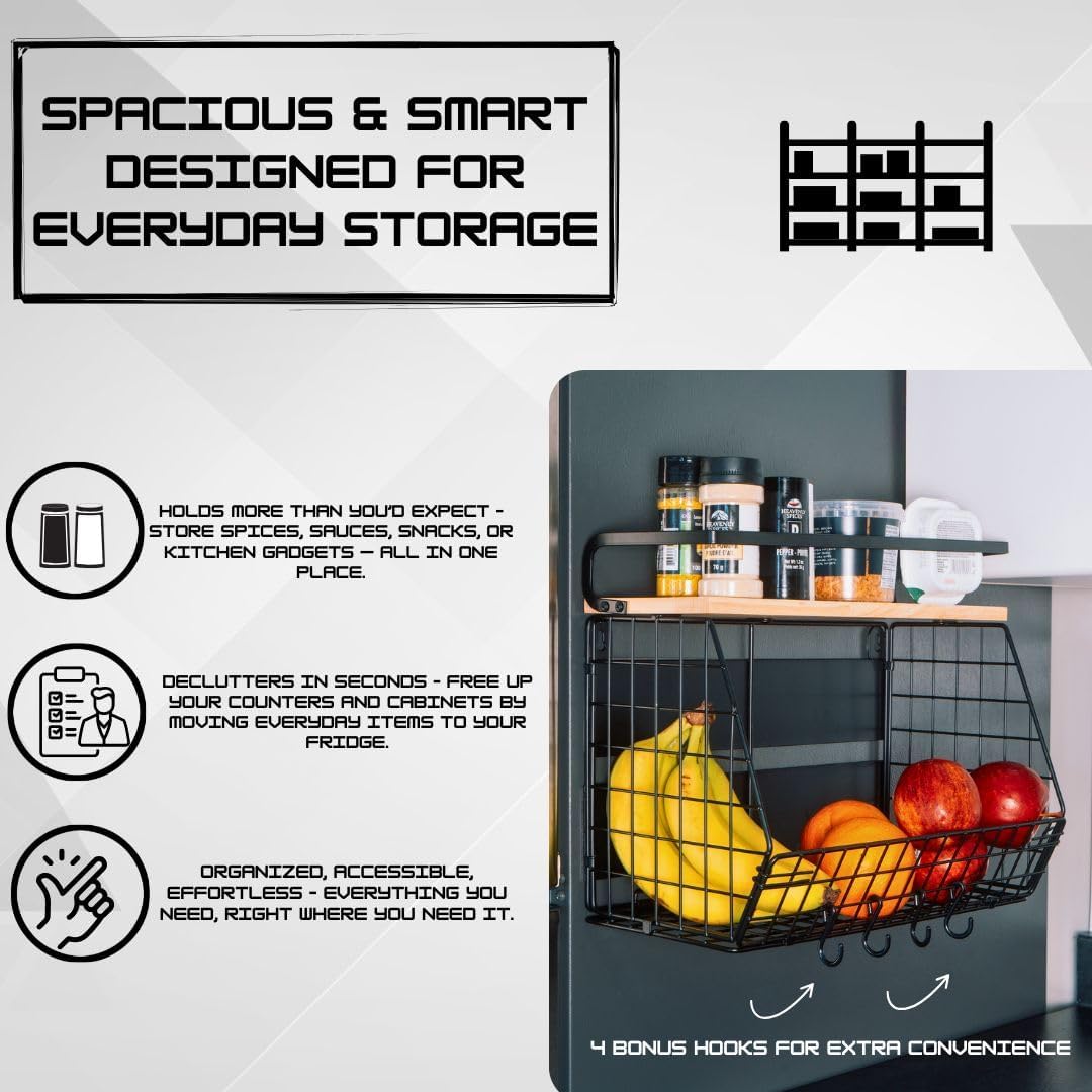 Magnetic Shelf For Fridge with Wood Lid - Fridge Magnet Organizer with 4 Hooks, Magnetic Basket for Fridge, Magnetic Storage for Refrigerator, Magnetic Spice Rack for Refrigerator