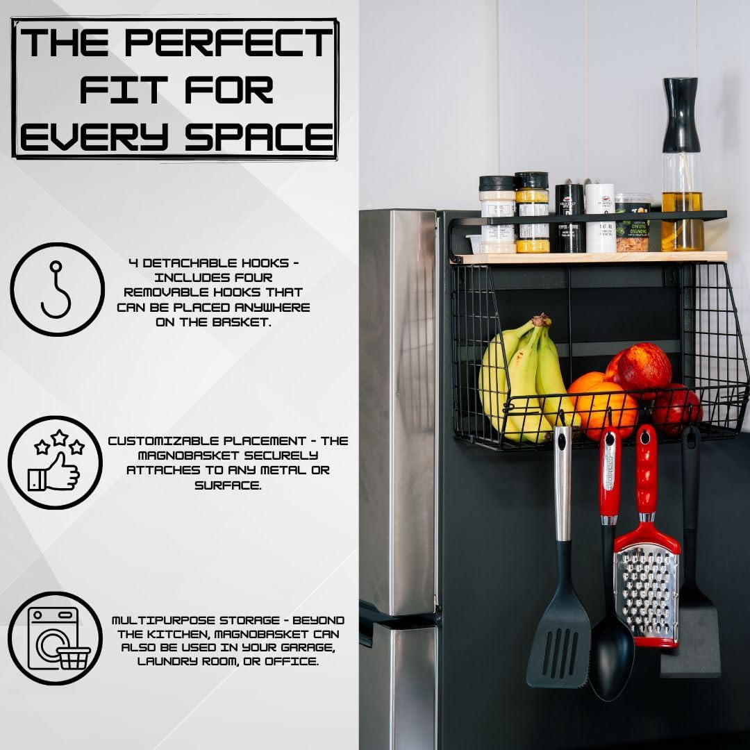 - ✅ Bonus 4 Hooks for Added Versatility – Store More Than Ever Each Magnobasket includes 4 removable side hooks that easily clip onto the basket’s sides. Hang spatulas, oven mitts, towels, keys, or other everyday tools — perfect for customizing your setup and maximizing vertical storage space.