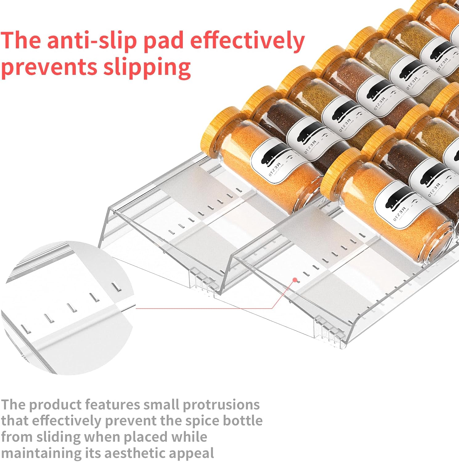 - 【Durable 2mm Thick Clear Acrylic】 Crafted from premium 2mm-thick clear acrylic, this spice rack is built for durability and style. The checkered frosted texture enhances its sleek look, while anti-slip silicone pads minimize movement during storage. Unlike traditional plastic or metal racks, it resists warping, breaking, yellowing, and rust, ensuring long-lasting performance.