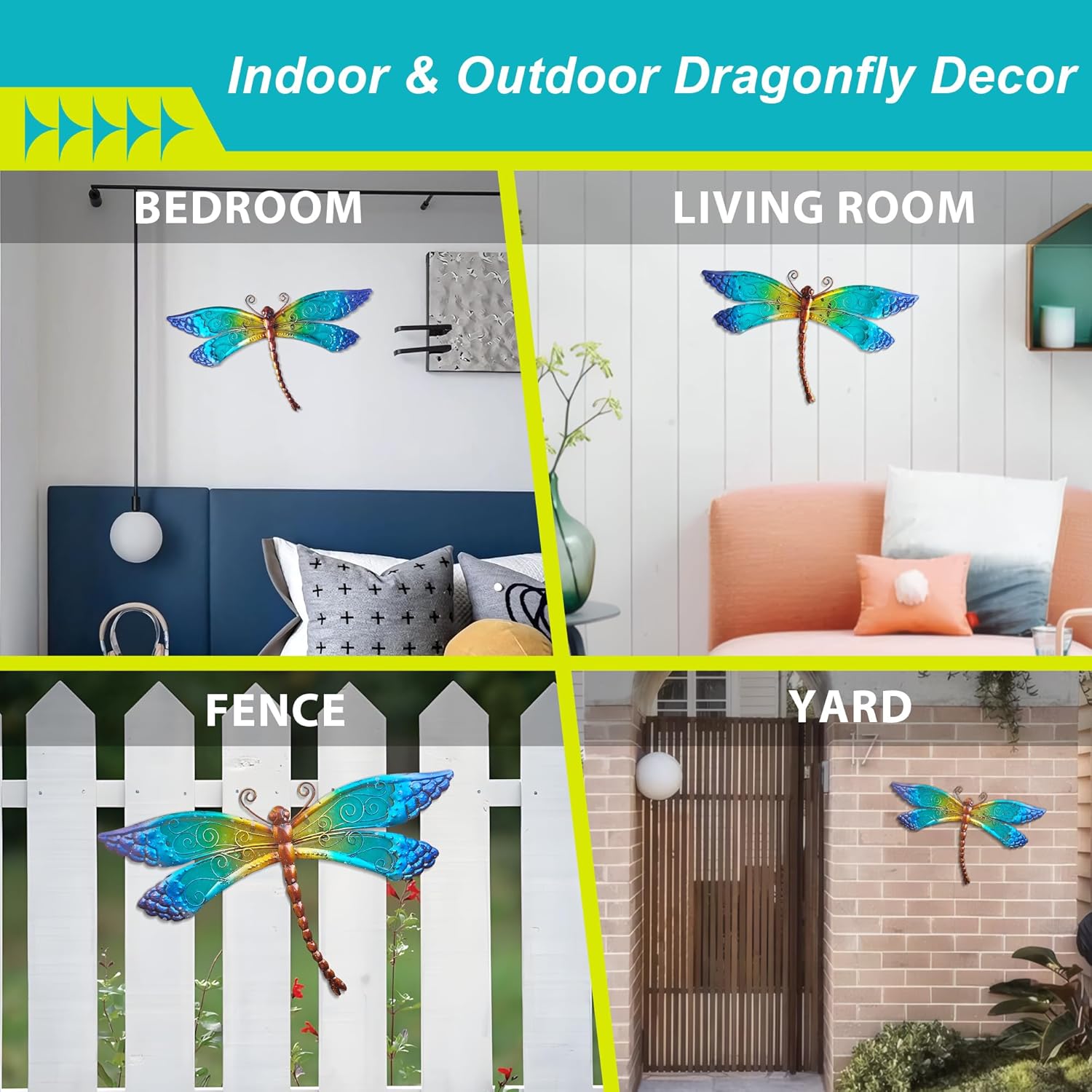 - HANDCRAFTED METAL & GLASS DESIGN: POXOHO Dragonfly Wall Art combines rust-resistant metal and shatterproof glass for durable outdoor/indoor use, featuring vibrant blue-green-yellow gradients that mimic natural landscapes. At 15 inch width and 8.6 inch height, it effortlessly enhances patios, fences, bathrooms, or bedrooms with wilderness-themed elegance.