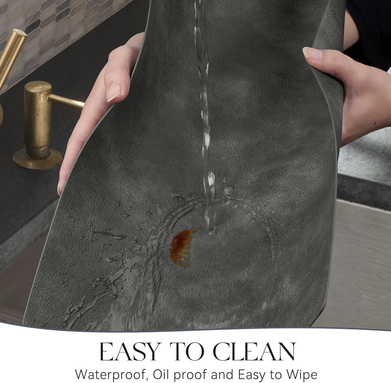 - HASSLE-FREE CLEANING: Our faux leather placemats are designed to be 100% waterproof to better protect the table from grease and grime compared to woven and fabric placemats. If the placemats get stained with sauce or food residue, simply wipe with a cloth or rinse with water.