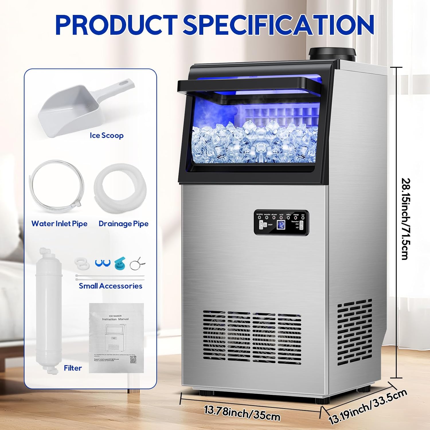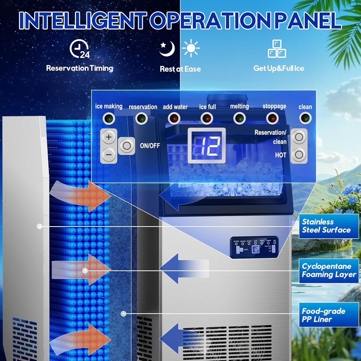 - [Smart LCD Control & Auto-Maintenance] - Intuitive LCD panel enables precise control: adjust ice thickness, set timers, troubleshoot errors, and activate self-cleaning/defrosting. Simplifies operation and maintenance like never before.