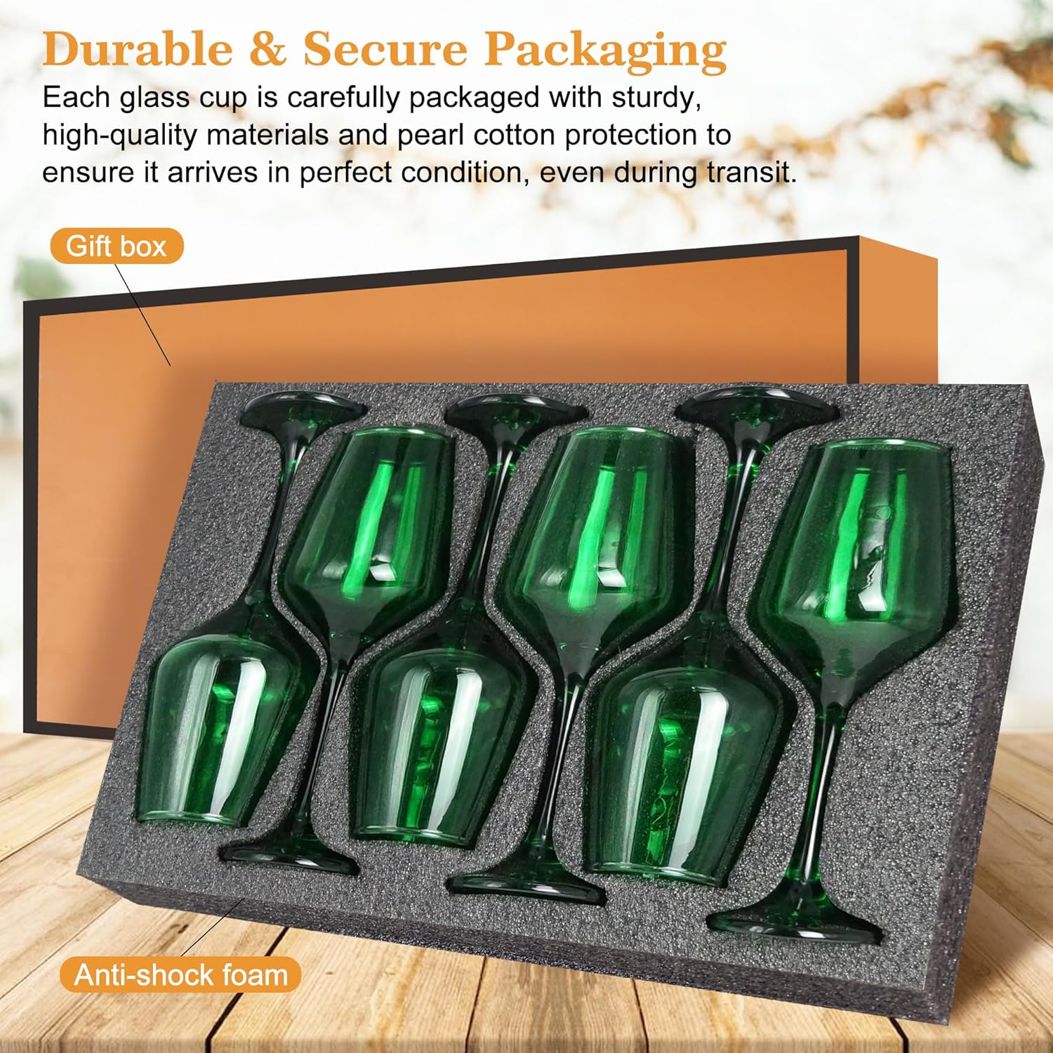 - ăElegant and Secure PackagingăGlazvia unique wine glasses is carefully packaged in an elegant and durable box to ensure safe delivery. The sturdy packaging protects the Green glasses drinkware during shipping, so you can be confident they will arrive in perfect condition. Whether purchasing for personal use or as a wine glasses gift set, this thoughtful packaging adds an extra touch of sophistication, making the unique wine glasses set of 6 as an wine glass gifts for women.