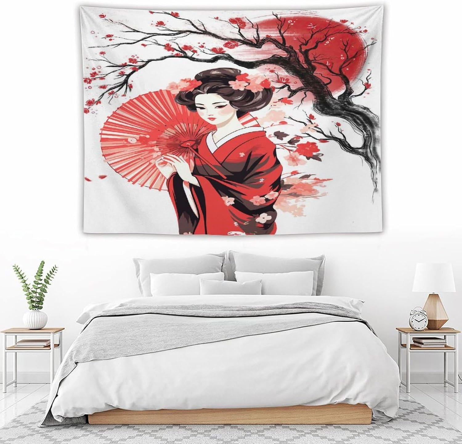 Japanese Red Geisha Tapestry Asian Cherry Blossom Traditional Kimono Folk Tapestries Home Decor for Living Room Bedroom Apartment Farmhouse Dorm 80"x60"