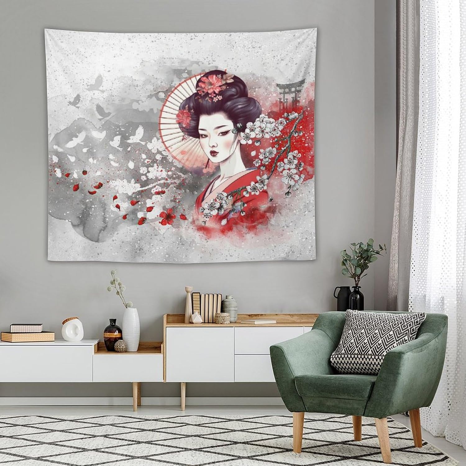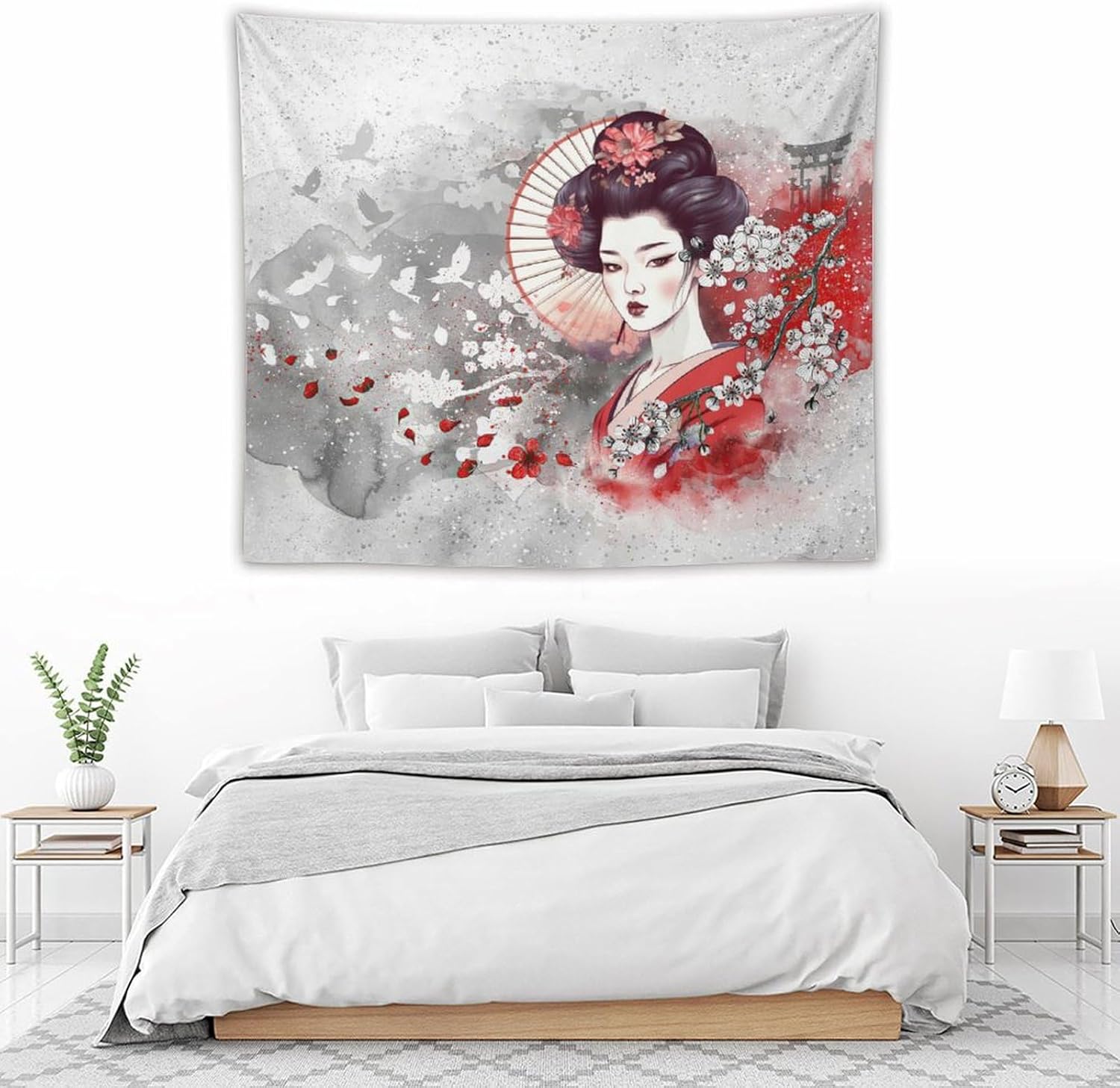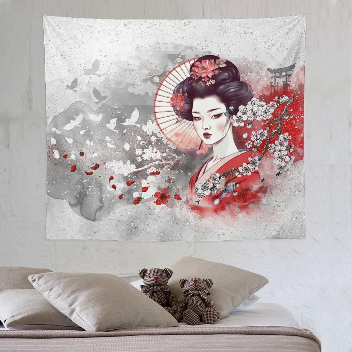 Japanese Geisha Tapestry Asian Red Cherry Blossom Traditional Kimono Folk Tapestries Home Decor for Living Room Bedroom Apartment Farmhouse Dorm 60"x50"
