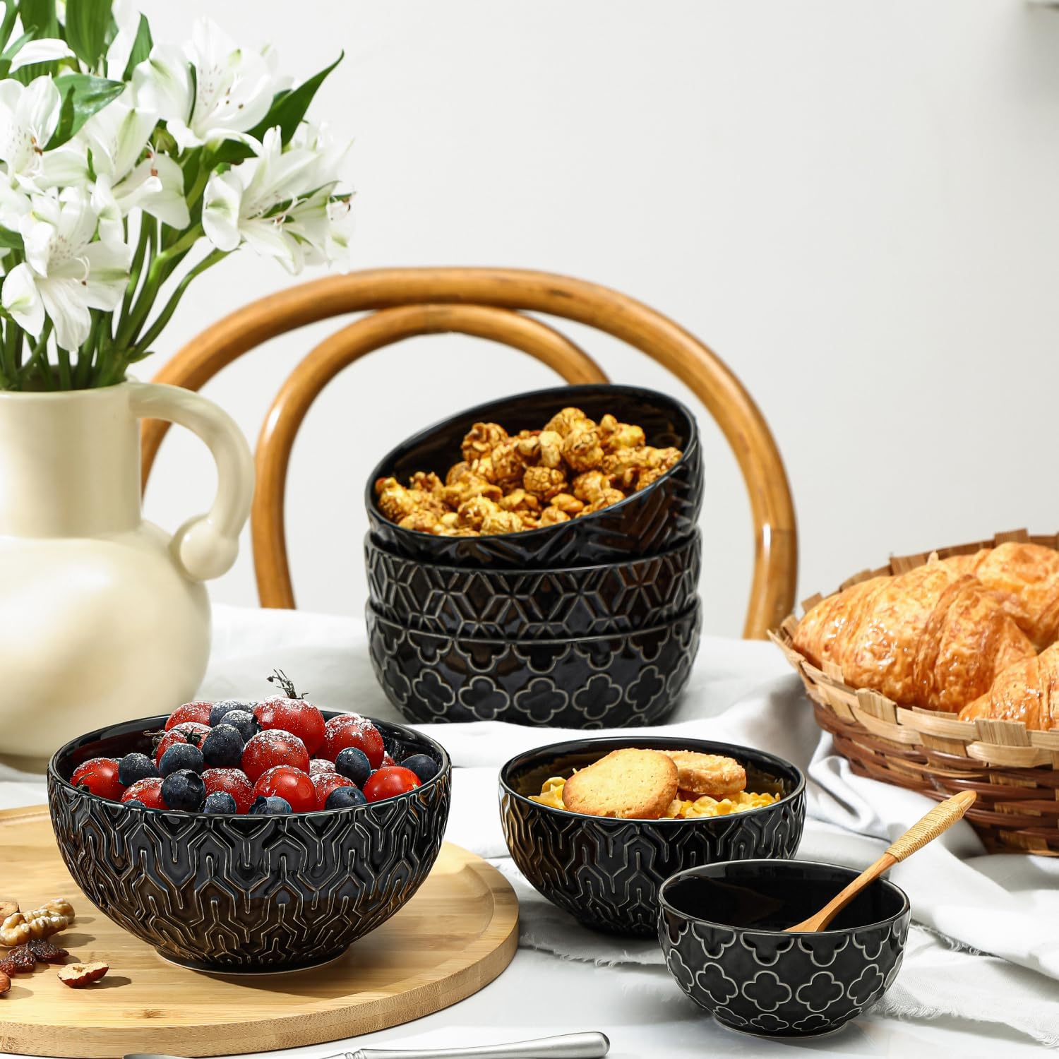 Sureasy Ceramic Ice Cream Bowls, 12oz Embossed Dessert Bowls Set, 4.6 Inch Stoneware Small Bowls for Snack, Sauce, Fruits, Microwave and Dishwasher Safe, Set of 4, Black
