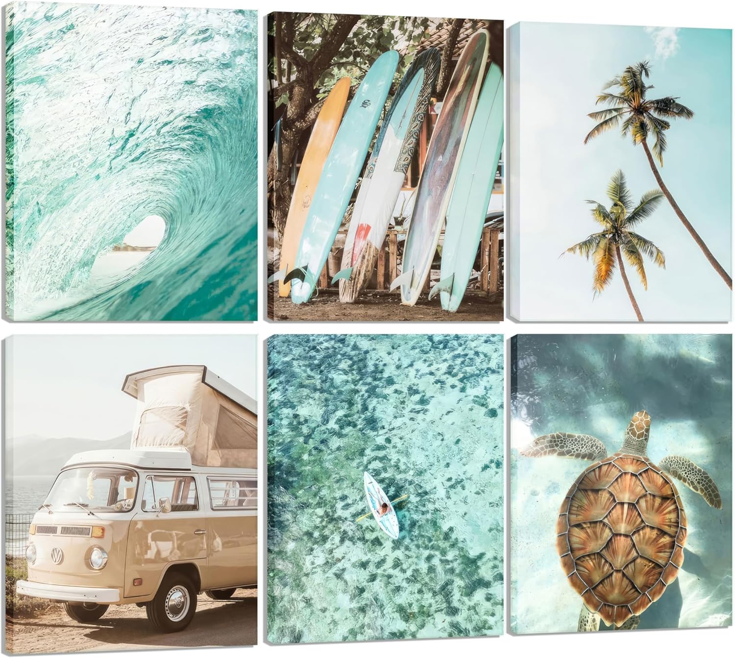 Set of 6 Tropical Beach Canvas Wall Art Surf Poster Summer Ocean Coastal Pictures Turtle Print Palm Tree Surfboard Gallery Paintings Nautical Bus Wall Decor for Bedroom Bathroom Framed