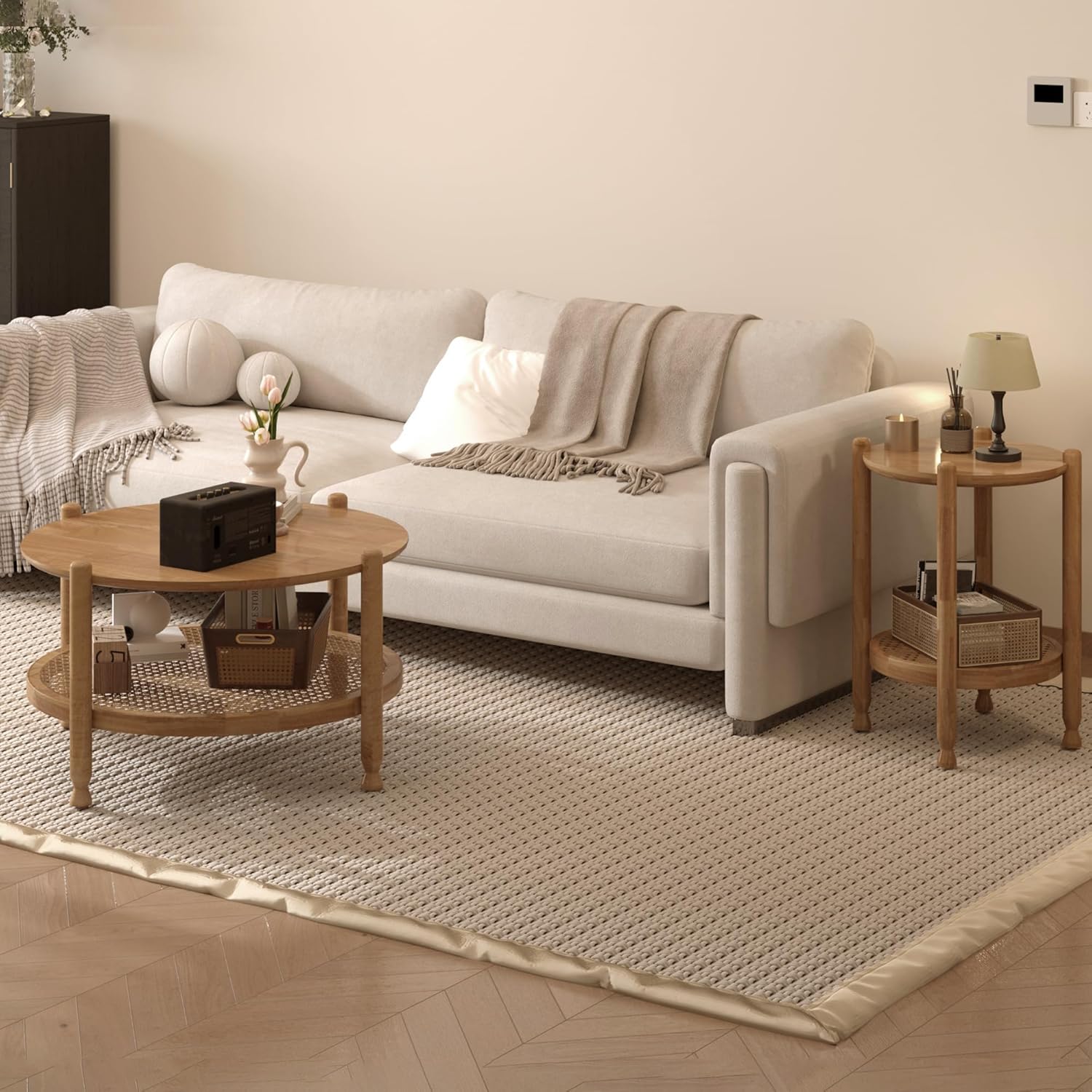 NSdirect Round End Table for Living Room, 2-Tier Rustic Wood Center Table for Home Decor with Boho Woven Rattan Storage Shelf | Modern Farmhouse Design, Easy Assembly, Oak