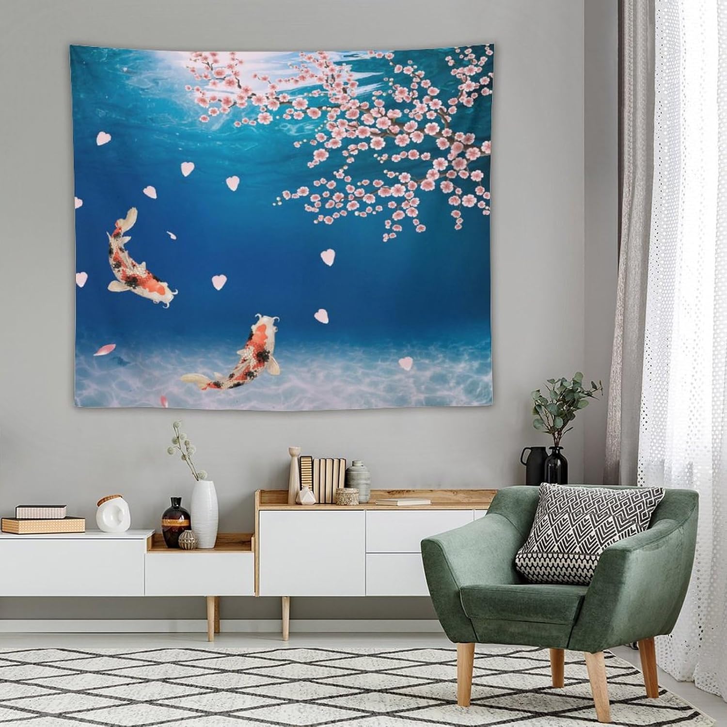 Japanese Koi Fish Tapestry, Cherry Blossoms Asian Oriental Blue Floral Branch Koi Fish Carp Tapestries Wall Hanging for Bedroom Living Room Office Decor 60"x50"