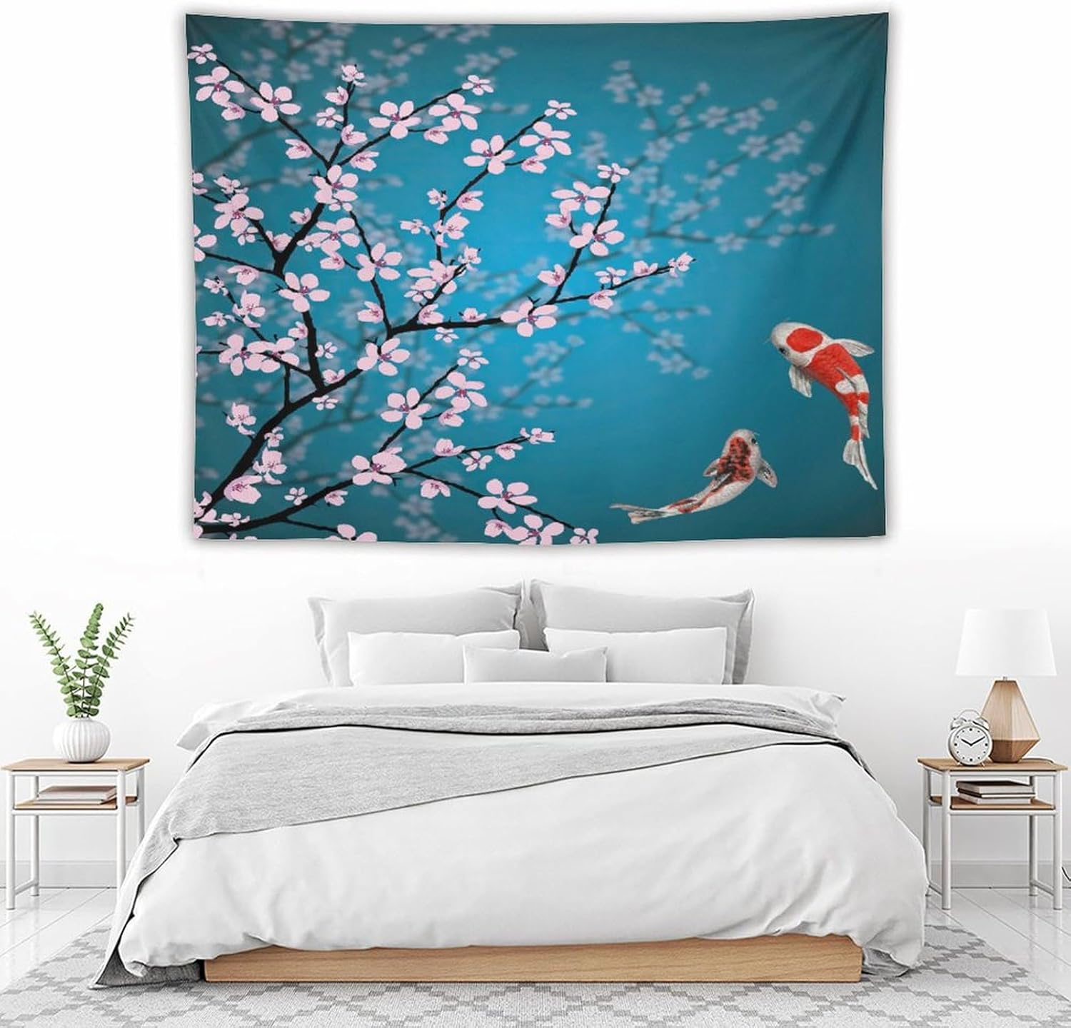 Houselerax Japanese Koi Fish Tapestry, Cherry Blossoms Asian Oriental Green Teal Flower Branch Koi Fish Carp Tapestries Wall Hanging for Bedroom Living Room Office Decor 80"x60"