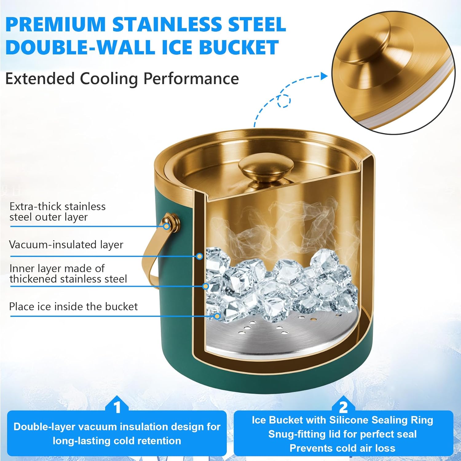 Ice Bucket, Green Ice Bucket 3L with Silicone Sealing Ring Double-Wall Vacuum Insulation Champagne Buckets with Filter Layer Ice Tongs Ice Scoop (Green, 3 L)