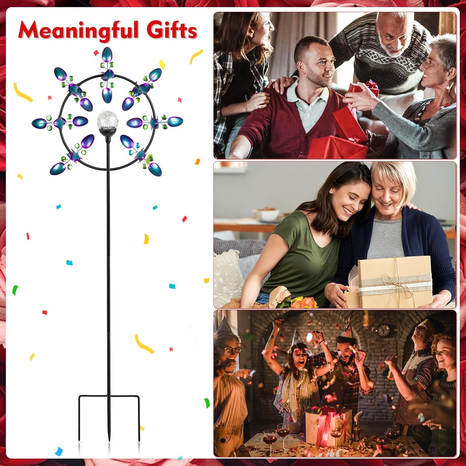 - 【Solar Powered Wind Spinners】Features a color changing LED crackle glass ball light which is powered by solar, Oversized 20.4-inch blades, and a durable metal garden stake. As night falls, it flashes a soft, jewel-like light, bright metal and changing lighting create visual enjoyment in the garden.