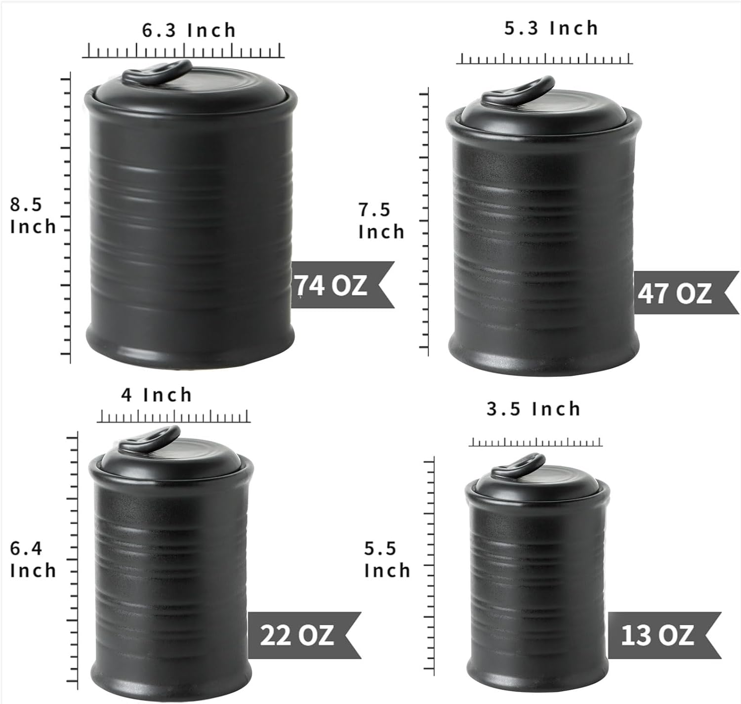 - [Sst of 4 Storage Jars] - Liquid capacity:13OZ , 22OZ , 47OZ..Small: 3.5"L x 4.5"H, Middle: 4.4"L x 5.6"H, Large: 5.3.6"L x 6.2"H, extra large: various sizes of jars with lids to meet your daily needs. Due to the different density of the particles, the solid storage capacity may not reach the maximum, which exists deviations.