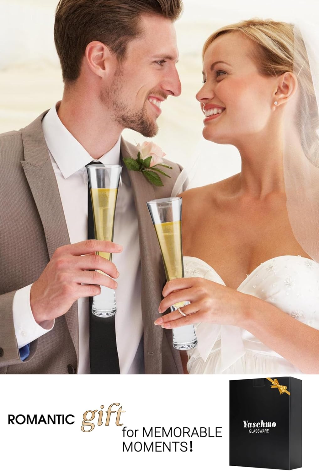 - ăModern & Exquisite Toasting FlutsăYaschmo champagne flutes feature a sleek, elongated silhouette that captures the essence of contemporary artistry. Designed with a refined small 5oz capacity, these glasses expertly channel bubbles from the base to the brim,intensifying aromas and enhancing the champagneâs effervescence. Whether youâre tasting vintage champagne, crisp Prosecco, or sparkling wine, the flutesâ graceful form and durable construction deliver a luxurious tasting experience.