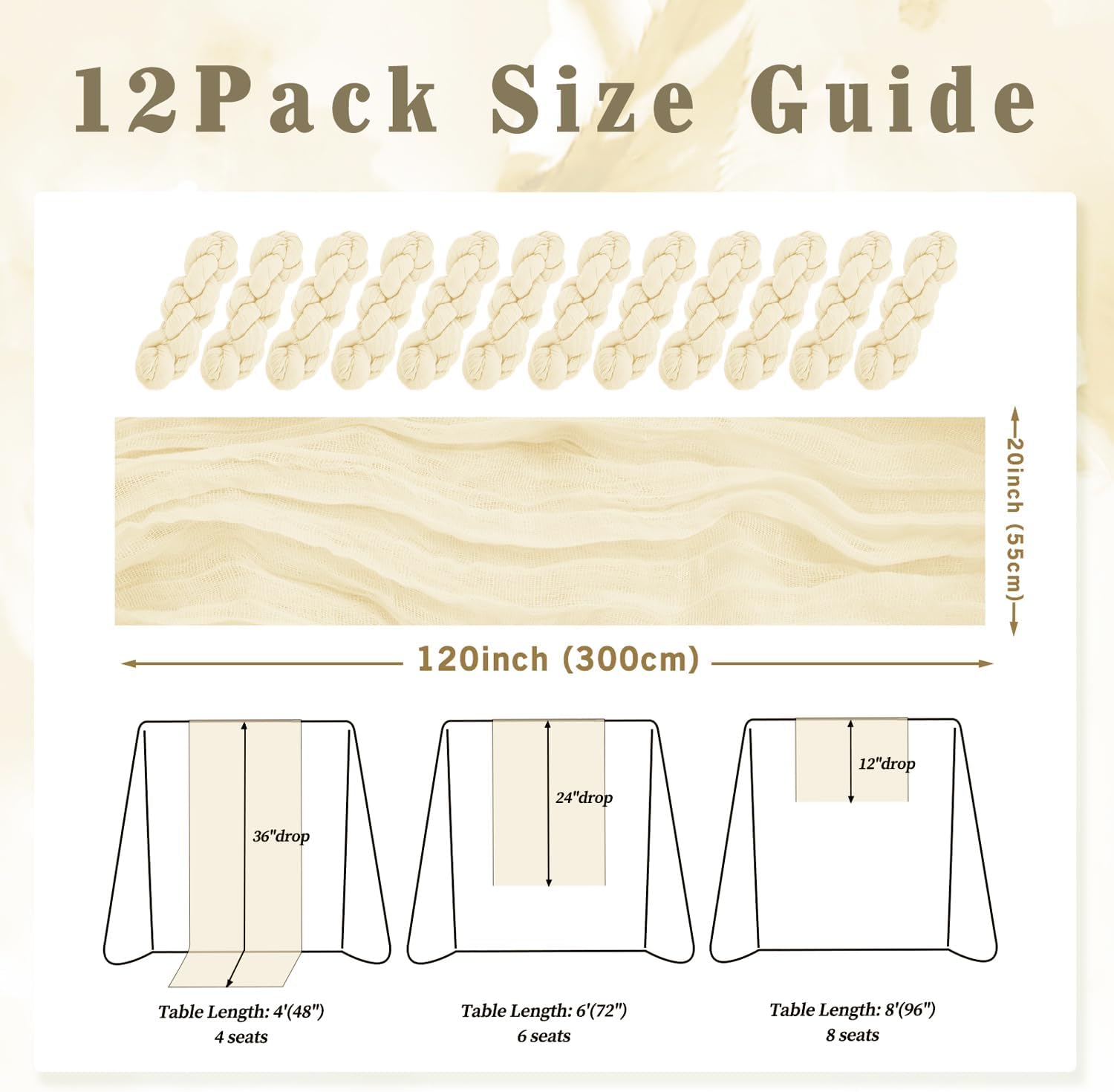 10FT 12 Pack Beige Cheesecloth Table Runner 20 x 120 Inch Long Rustic Gauze Fabric Cheese Cloth Table Runner for Wedding Bridal Baby Shower Table Decorations Boho Sheer Birthday Party Table Decor