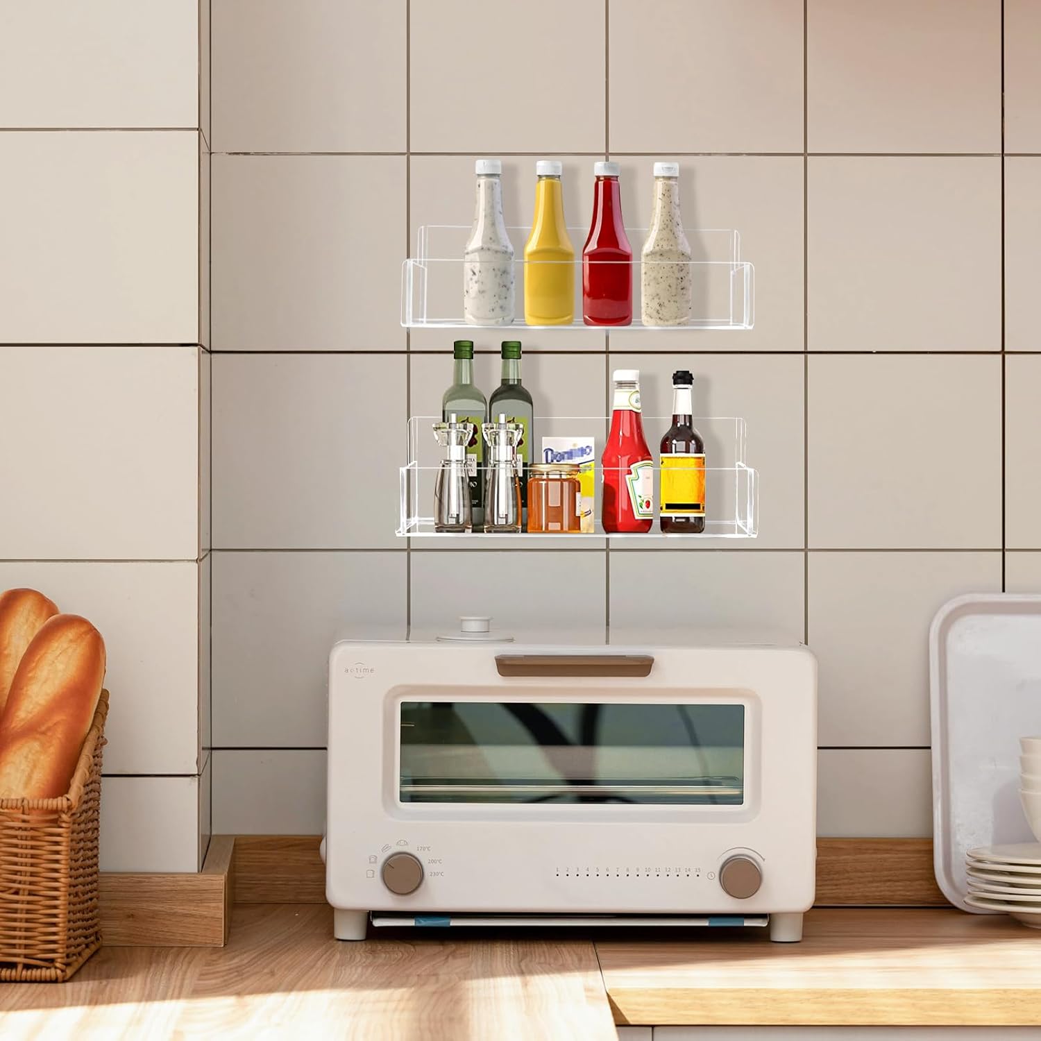 Acrylic Spice Rack Wall Mount-9 Inch, Clear Spice Shelf Storage Holder, 2 Pack Hanging Seasoning Rack Organizer for Cabinet Door, Cupboard or Wall Kitchen (Adhesive or Screw)