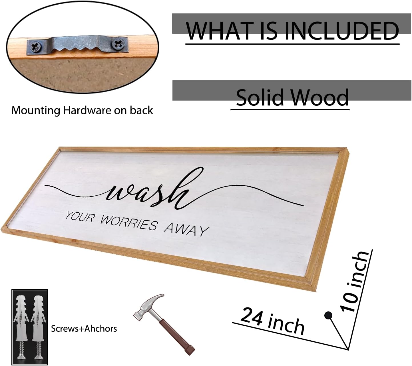 Wash Your Worries Away Bathroom Wall Art 24×10 Inch Wood Framed Decor Funny for Laundry Room Restroom Modern Rustic Inspirational Sign (Wood)