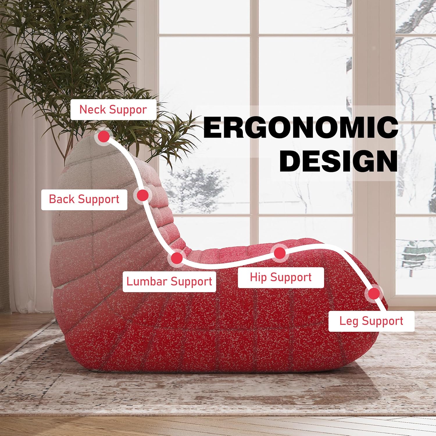 - ăErgonomic Designă-Designed with your comfort in mind, the bean bag chair features a thoughtful ergonomic design that provides exceptional support for your neck, back, lumbar, hip and leg region. The loveseat high-elastic memory foam filling conforms to your body, offering targeted support and ensuring a cozy sitting experience.