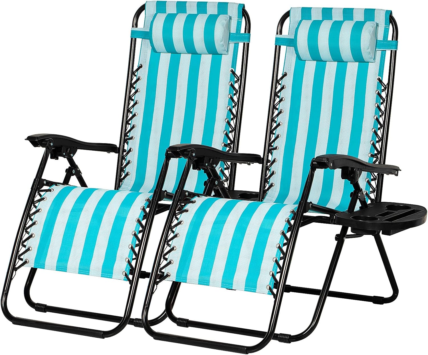 Nazhura Set of 2 Relaxing Recliners Patio Chairs Adjustable Steel Mesh Zero Gravity Lounge Chair Beach Chairs with Pillow and Cup Holder (Light Blue Stripe)