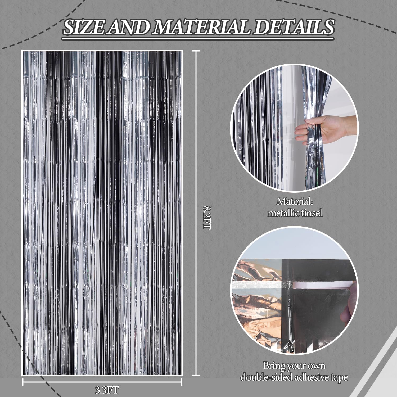 - 【3 Sets of Foil Fringe Curtains】Each package includes 3 sets of 3.3x8.2 ft foil fringe curtains, providing enough length to decorate your party with ease. Perfect for creating a stunning backdrop for any occasion.