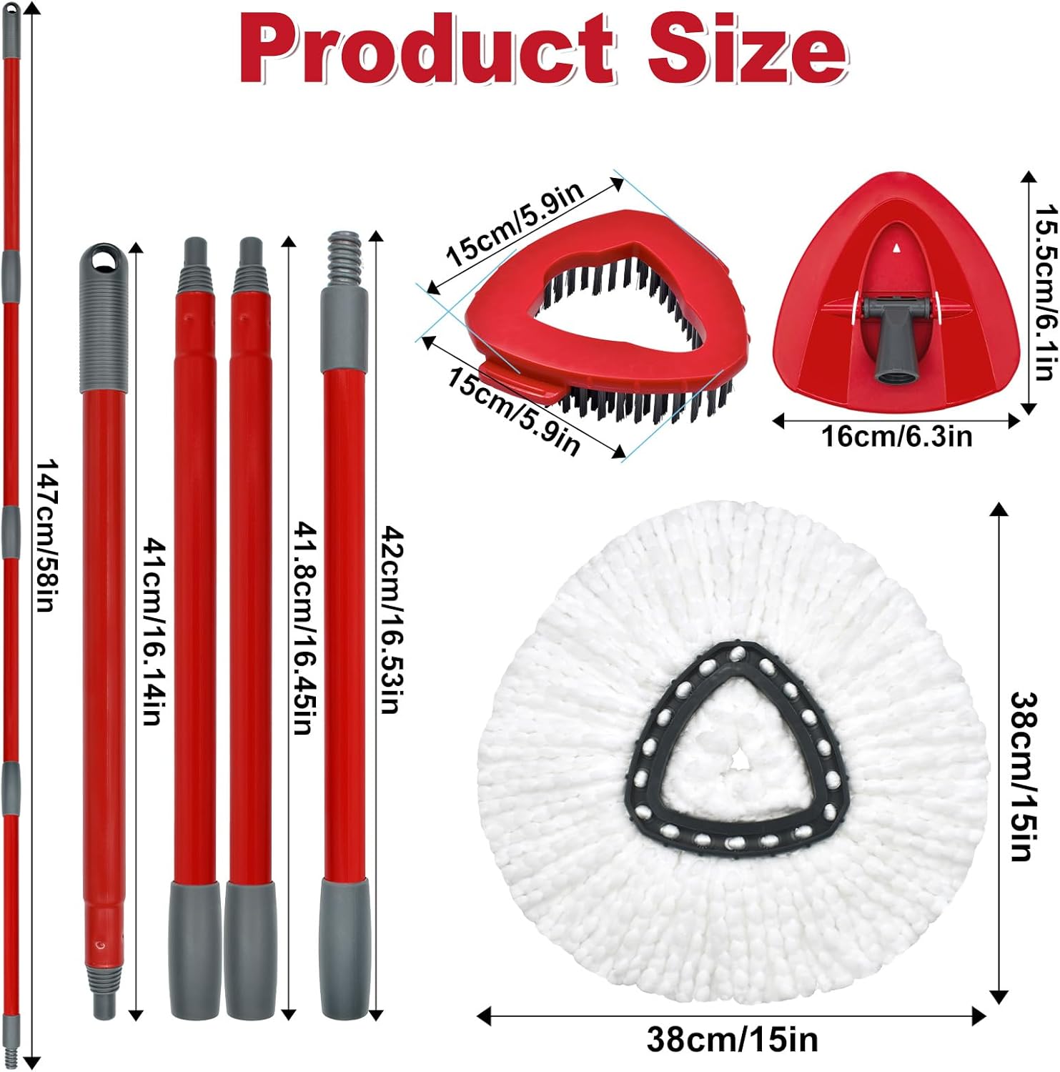 - ใValuable Oceda Mop SetsใIncludes 2 Rinseclean's microfiber mop head, 4-section iron mop handle that extends from 30-58", and 1 spin mop head base and 2 triangular brush.Spin mop head replacement units replace are easy to install and remove,the triangular chassis design harmless your furniture.
