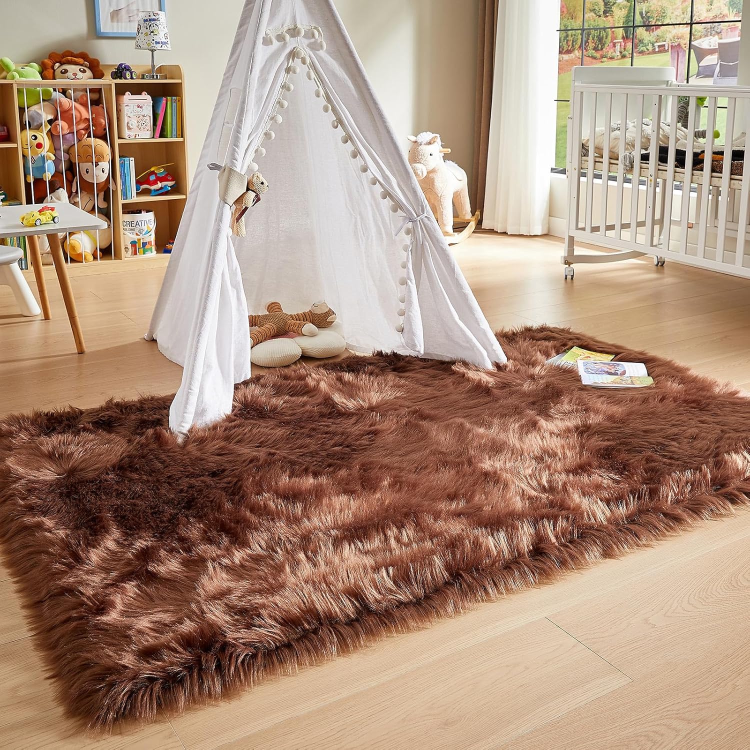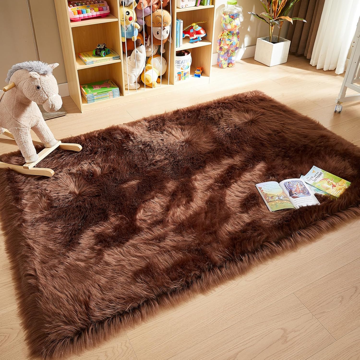 AMTOVO Faux Fur Sheepskin Rug for Living Room, 4 x 6 ft Coffee Fluffy Area Rug for Bedroom, Playroom, Luxury Room Decor, Rectangle