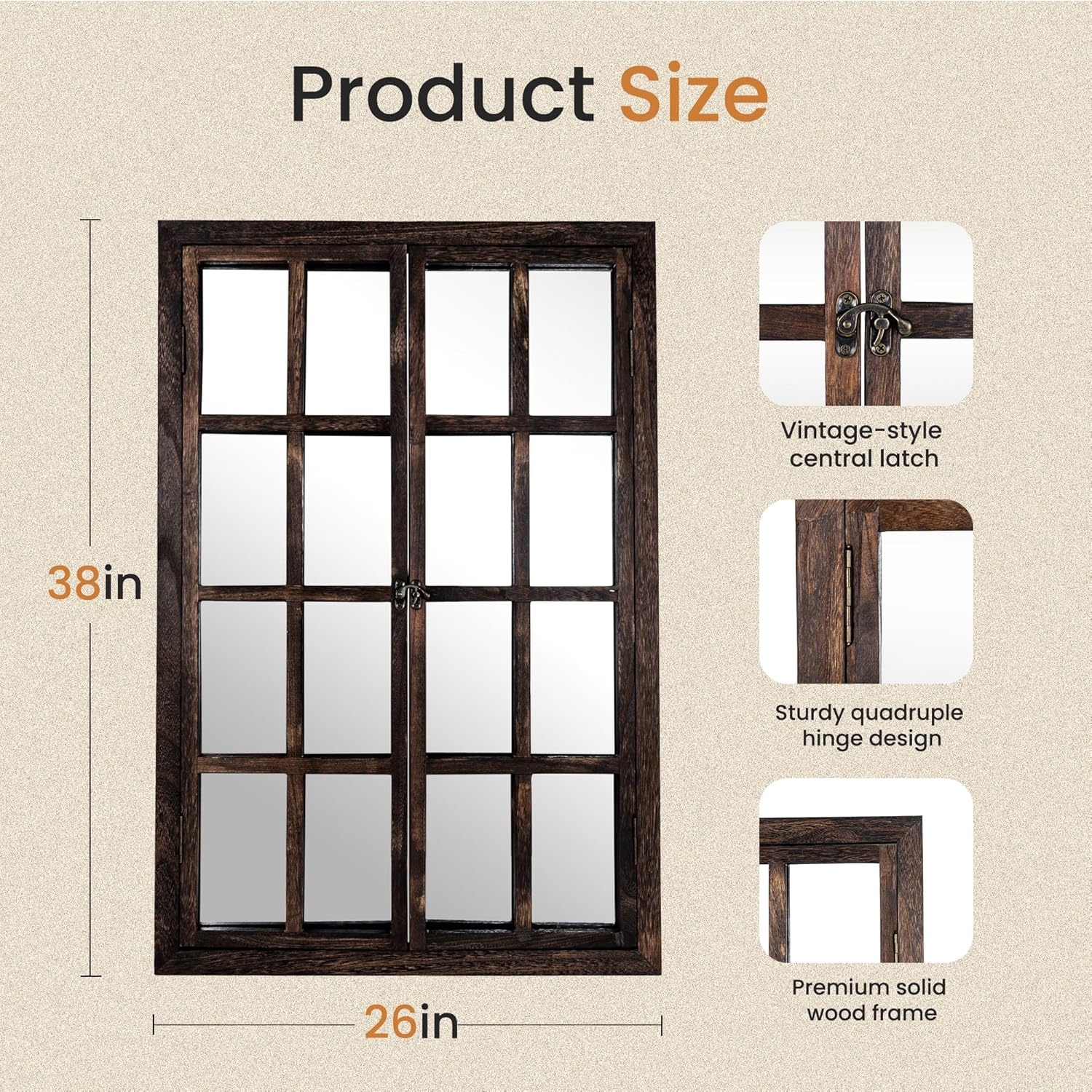Wall Mirror with Window Design, 38"x26" Rustic Farmhouse Wood Mirror for Wall Decor, Decorative Vintage Mirror for Living Room, Bedroom, Entryway