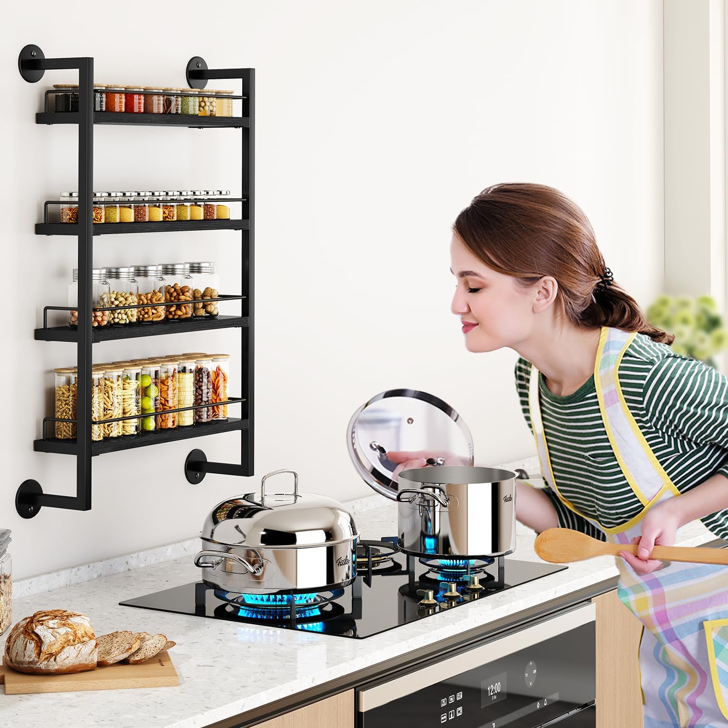 IBUYKE Spice Rack Wall Mount,4 Tier Hanging Seasoning Organizer, Spice Rack for Wall for up to 50 Jars,Spice Organization for Kitchen Cabinet,Living Room,Bathroom,Pantry,Black UTLJ016B