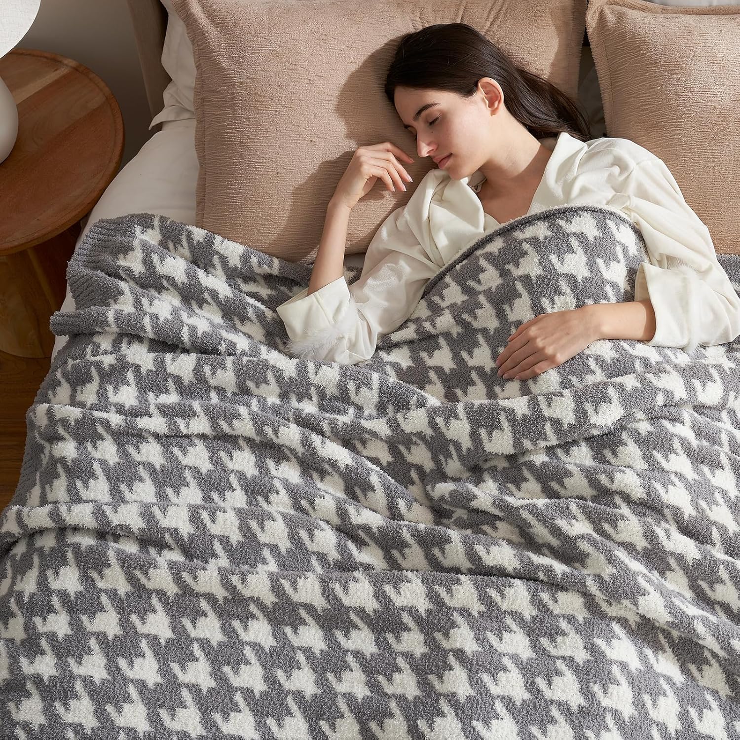 Snuggle Sac Houndstooth Throw Blanket for Couch, Reversible Super Soft Warm Blankets Cozy Knit Fuzzy Plush Lightweight Throws for Sofa, Bed, Camping, Grey,50x60 inches