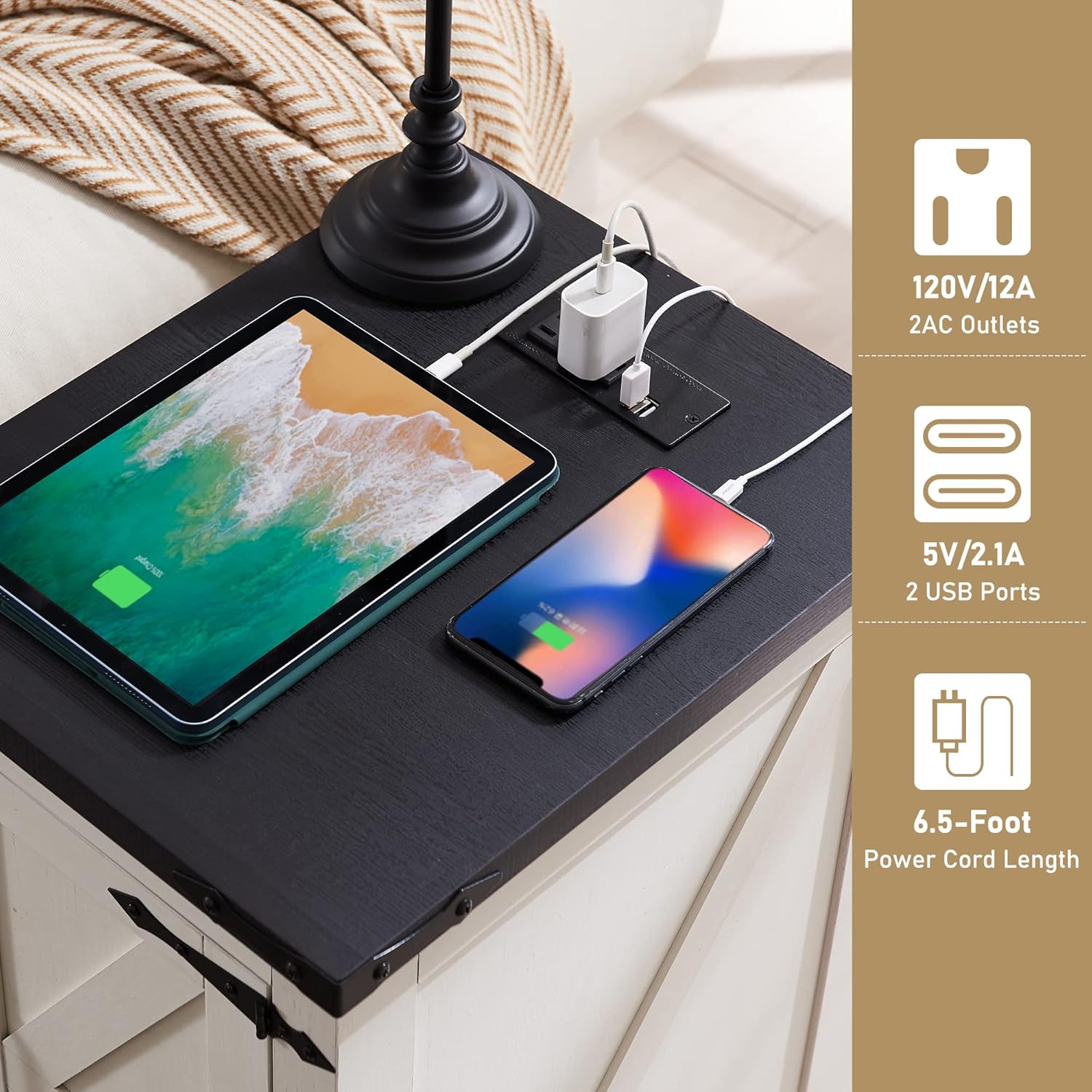 JXQTLINGMU Farmhouse Nightstand Set of 2 with Charging Station, 17" D Rectangular End Table with Barn Door & Adjustable Storage Shelf, Wood Rustic Sofa Side Table for Living Room, Bedroom, White